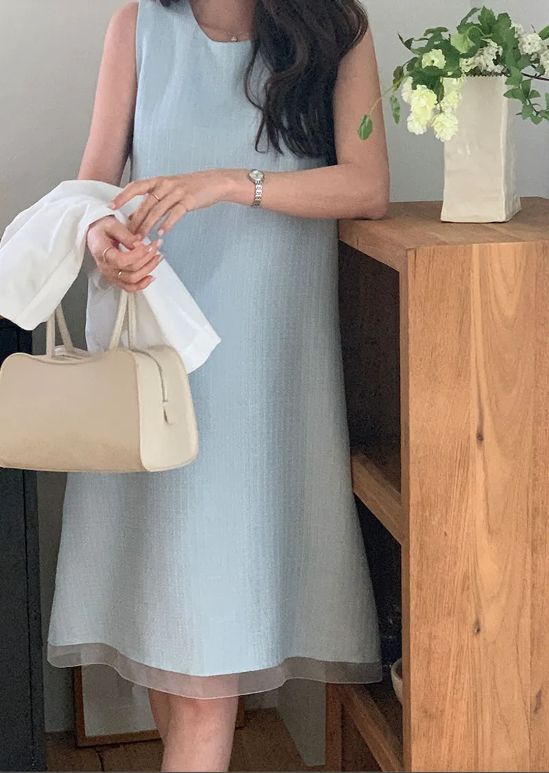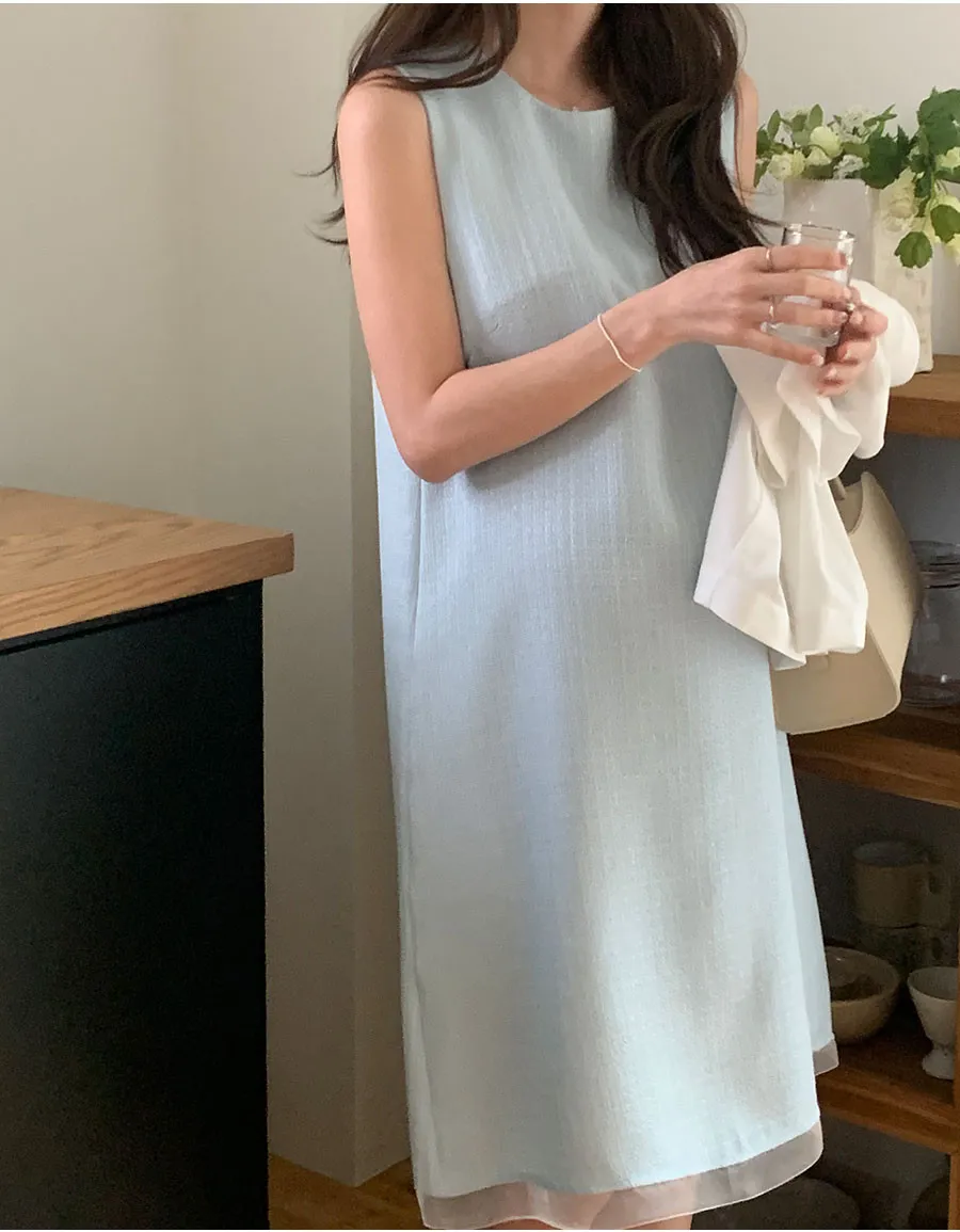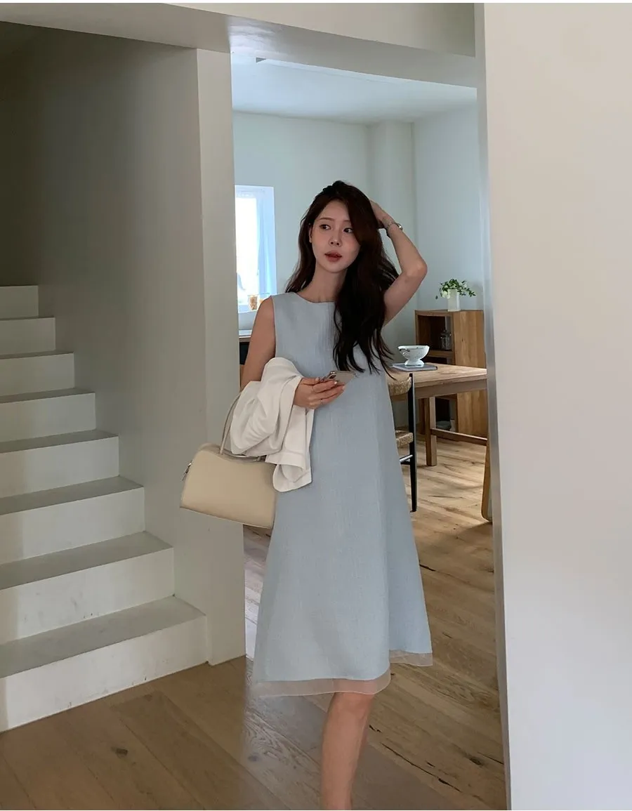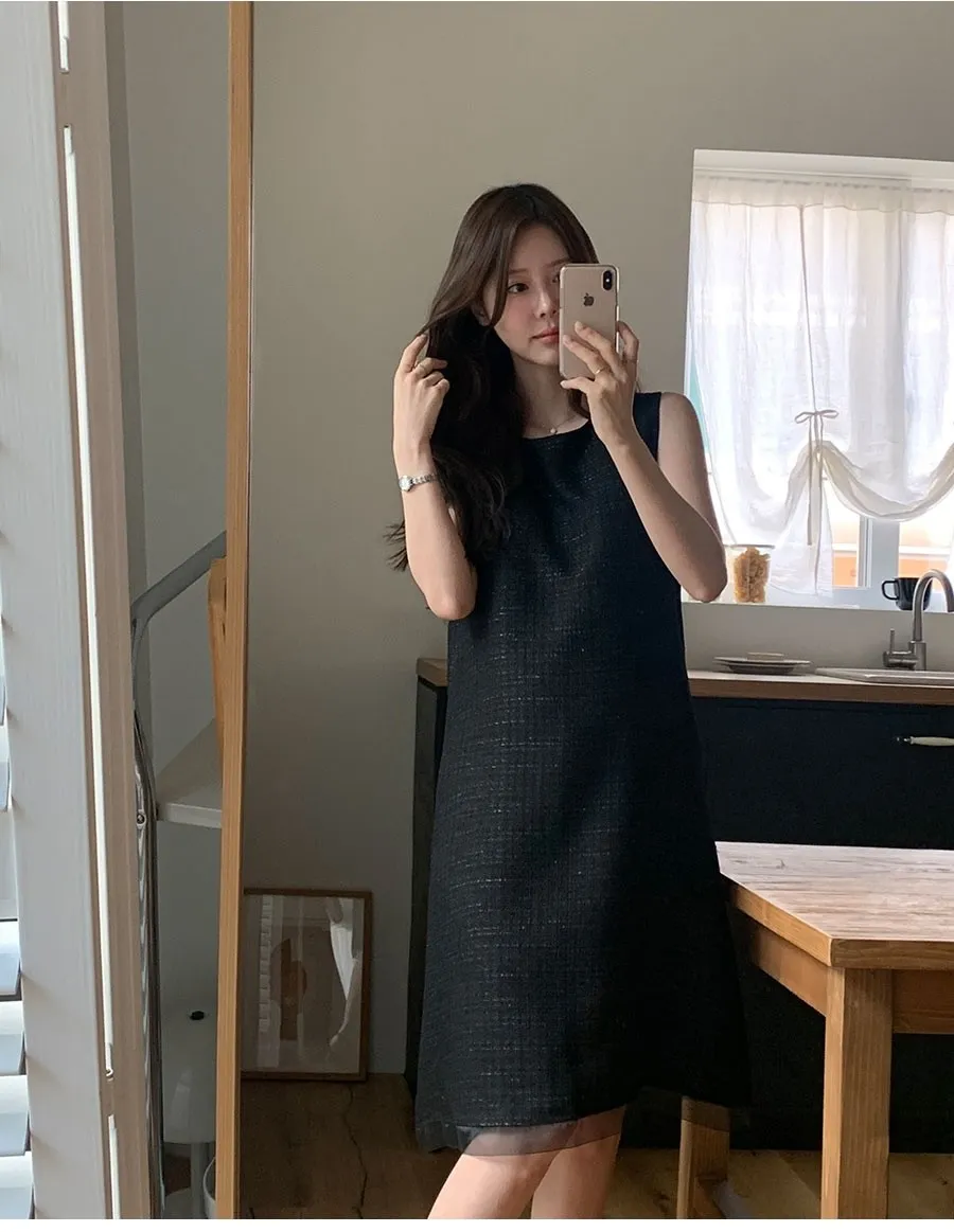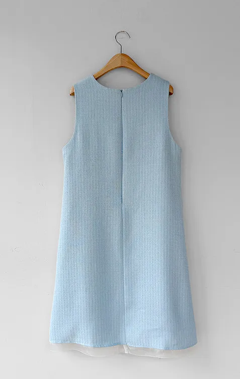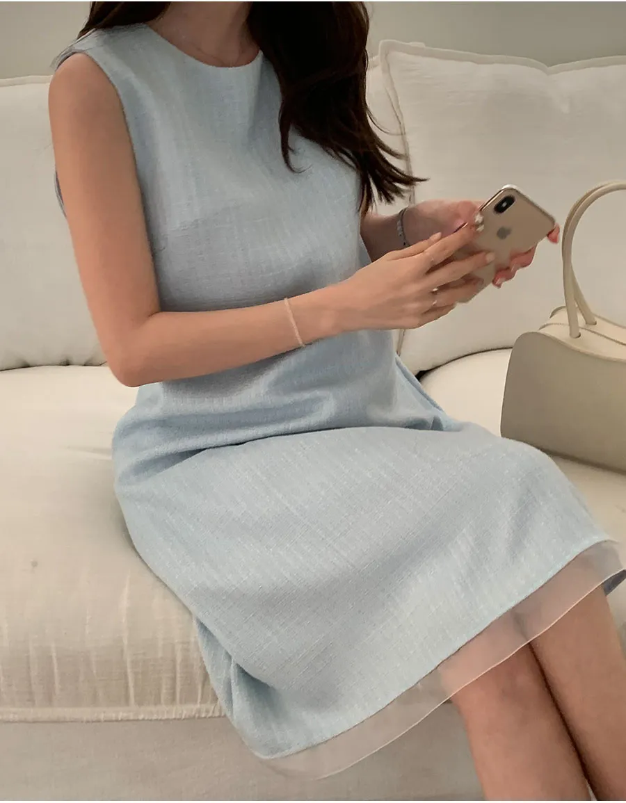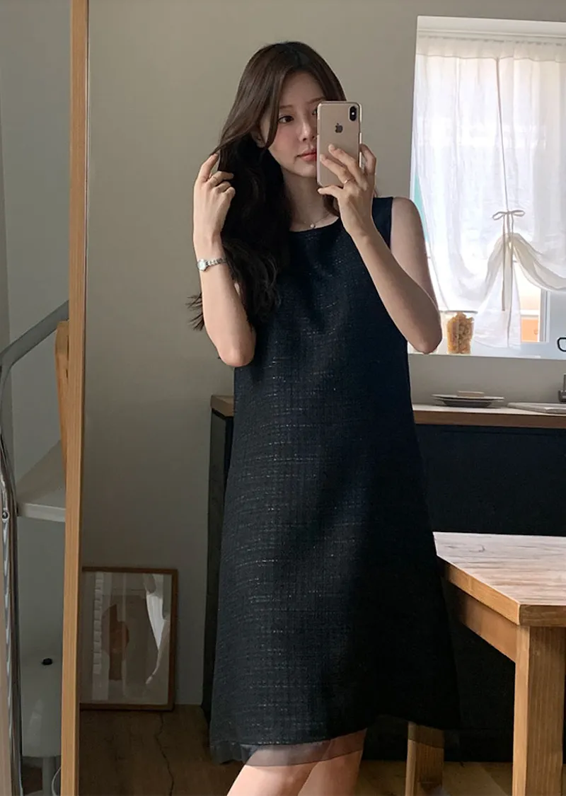 柔美下擺薄紗層疊A字輪廓無袖花呢連身裙