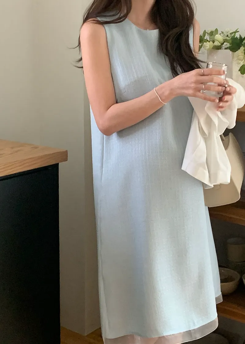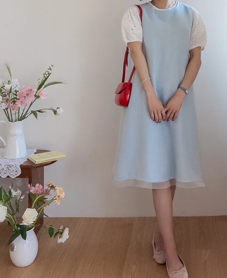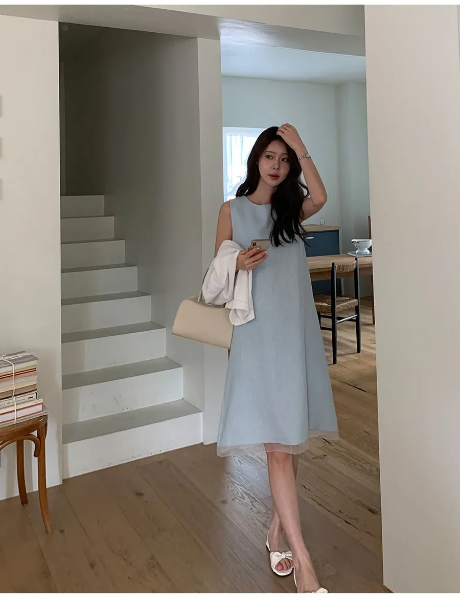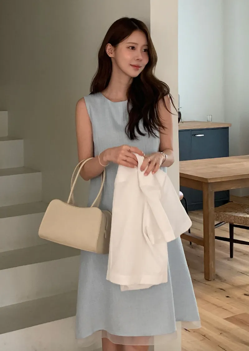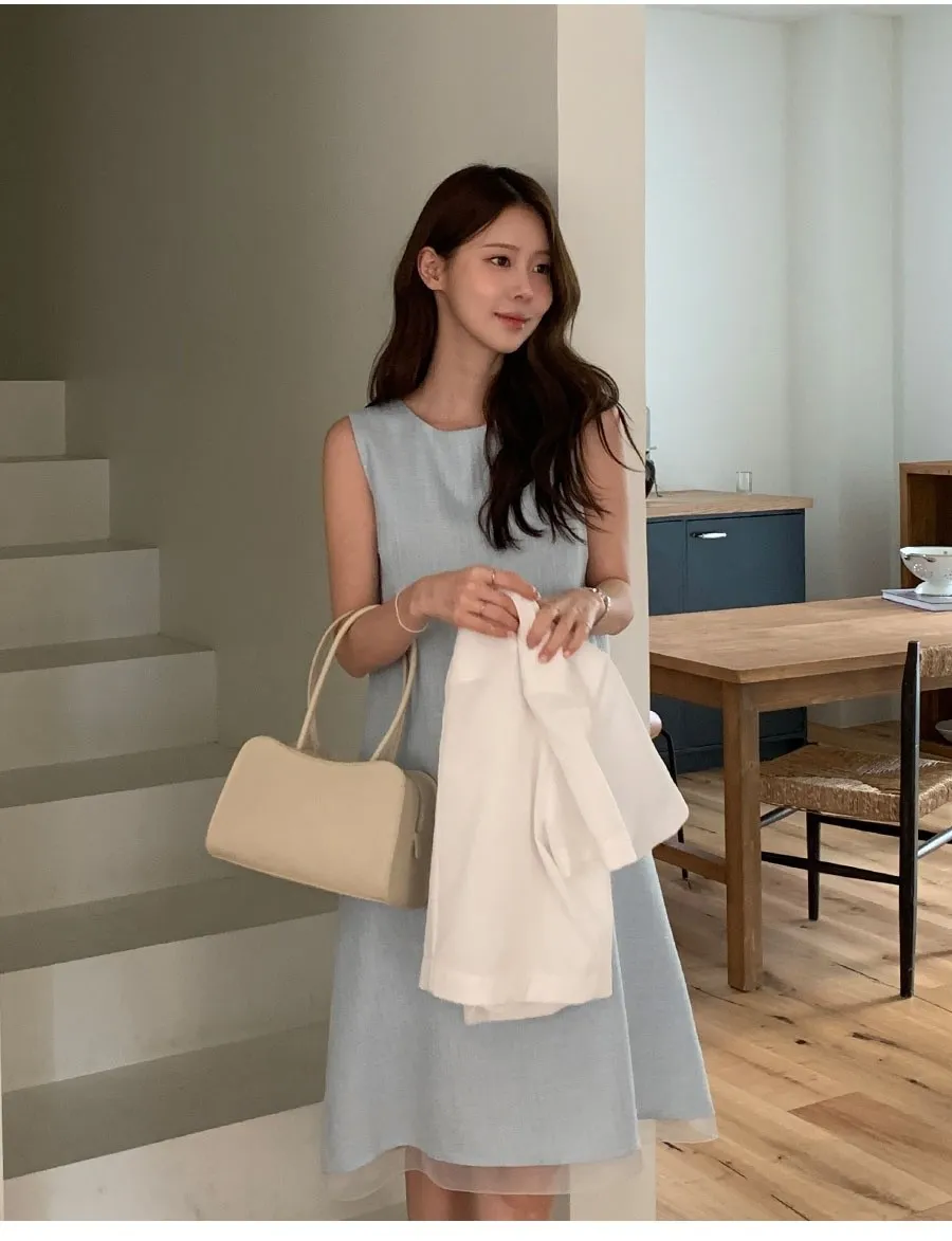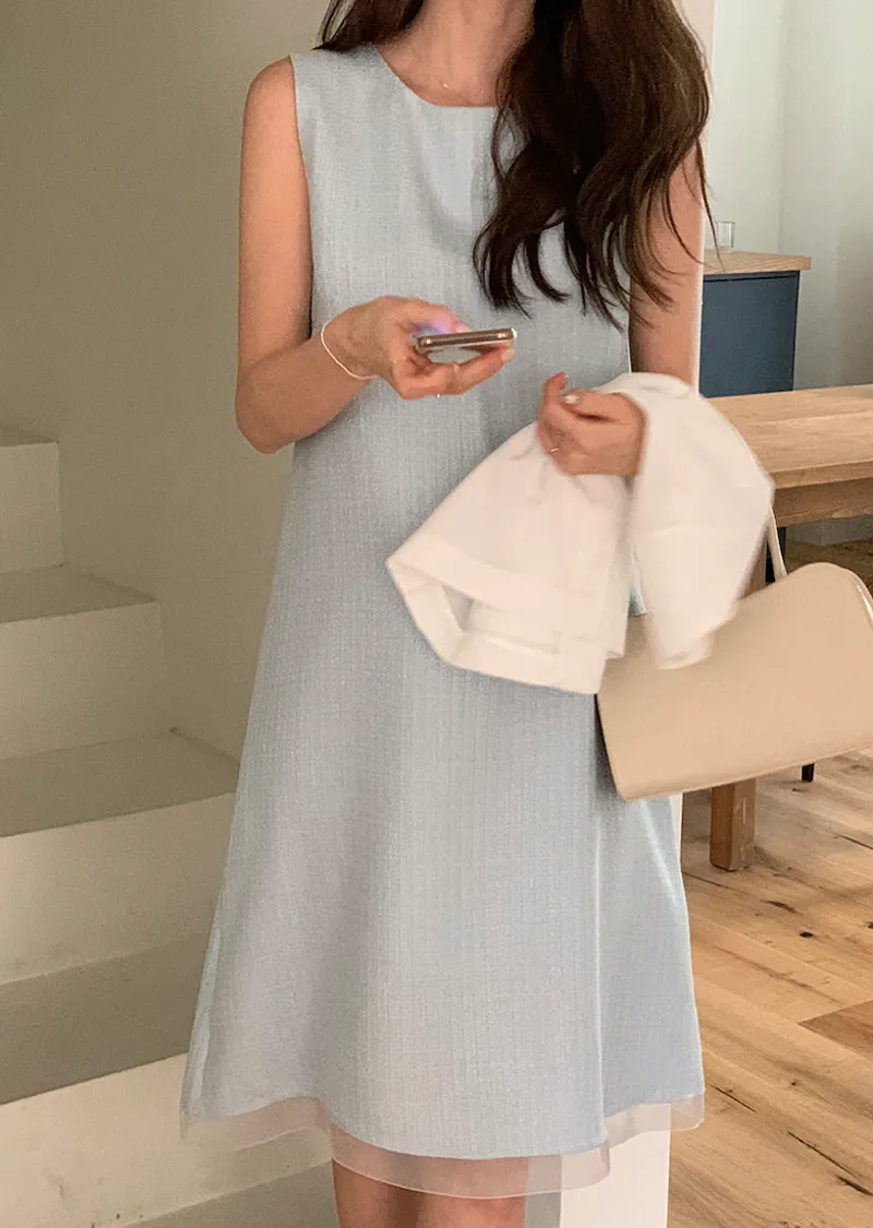 柔美下擺薄紗層疊A字輪廓無袖花呢連身裙