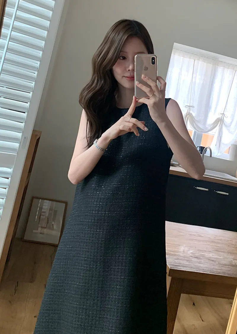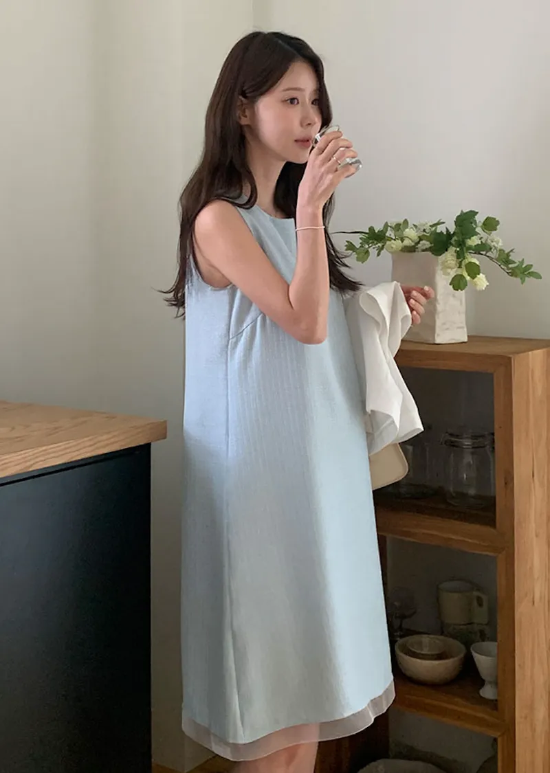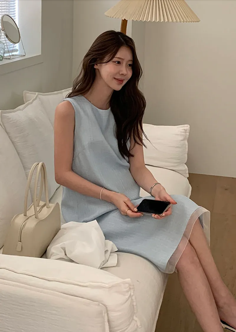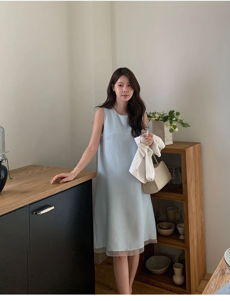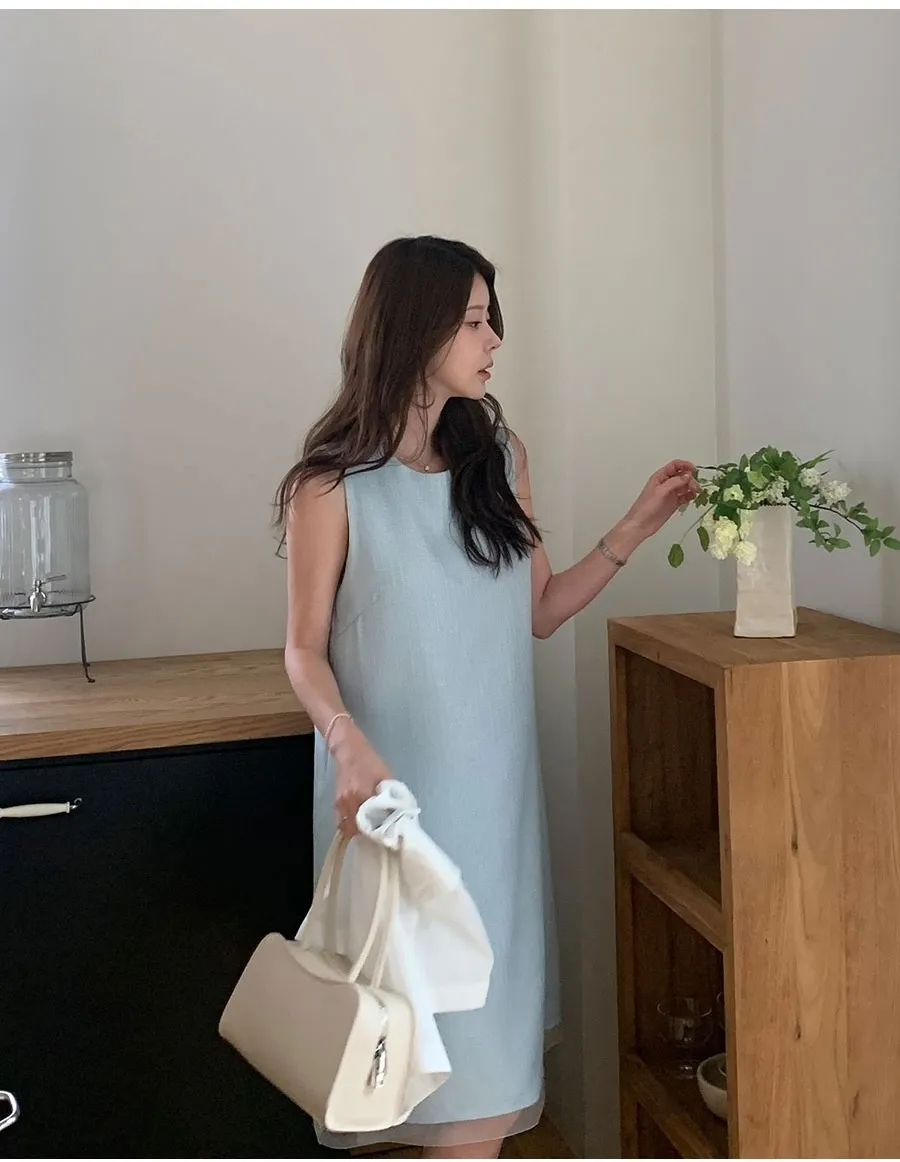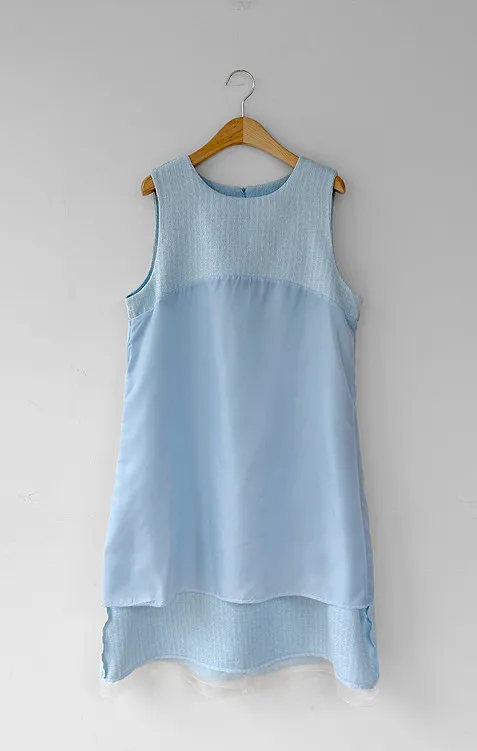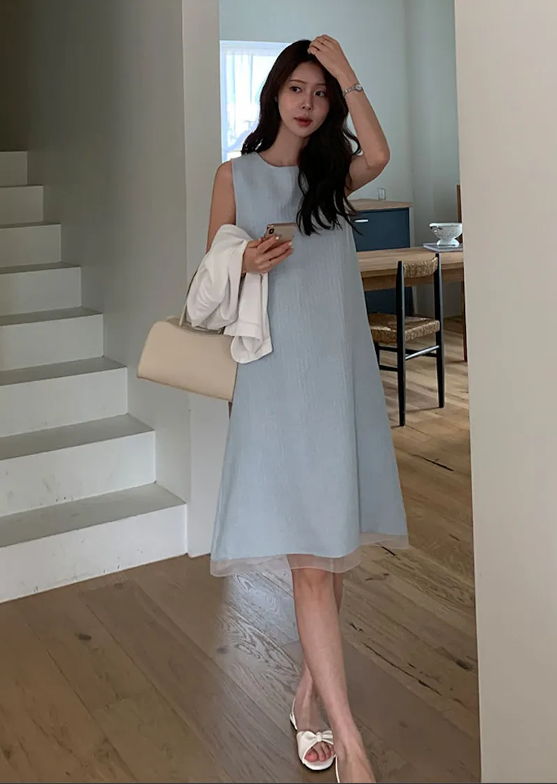 柔美下擺薄紗層疊A字輪廓無袖花呢連身裙
