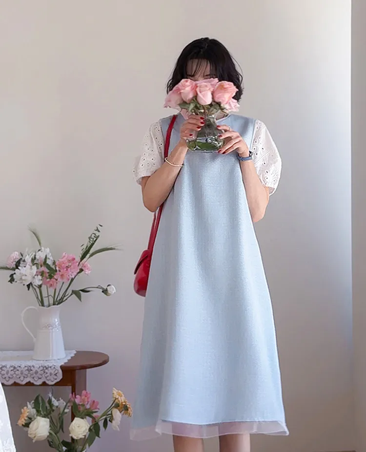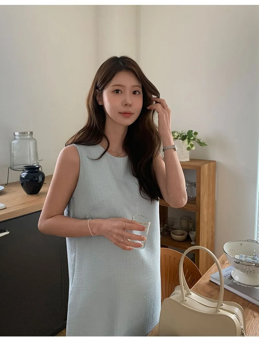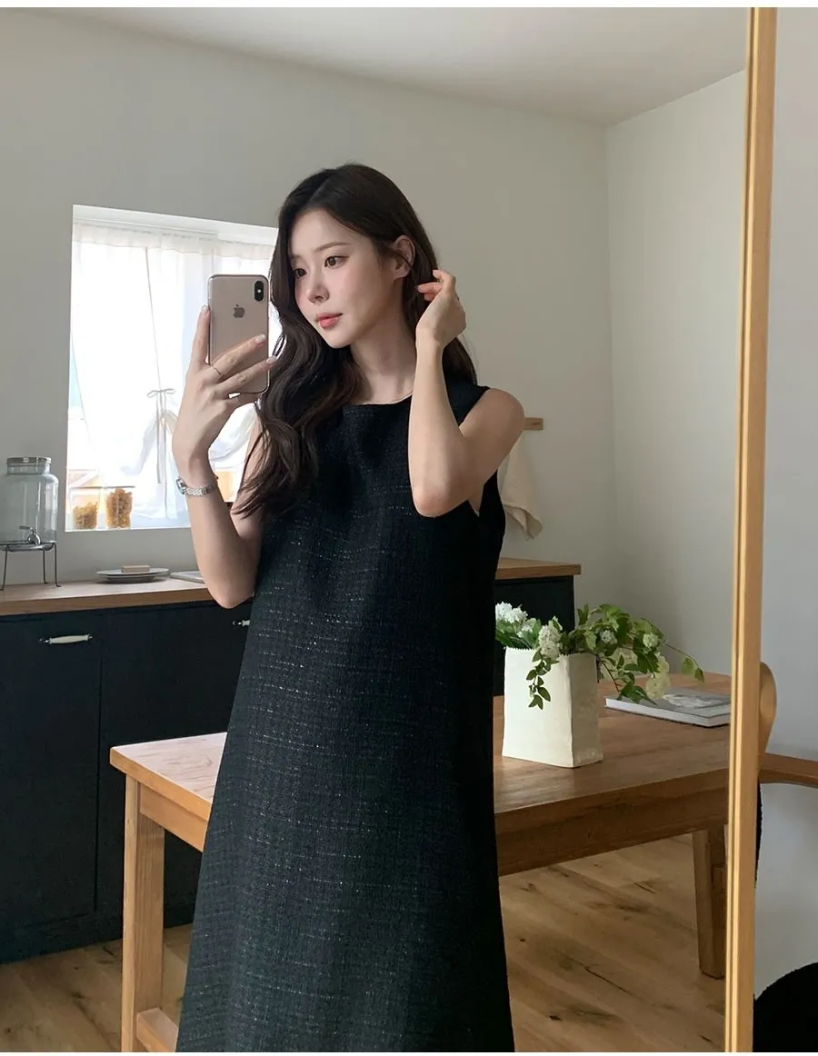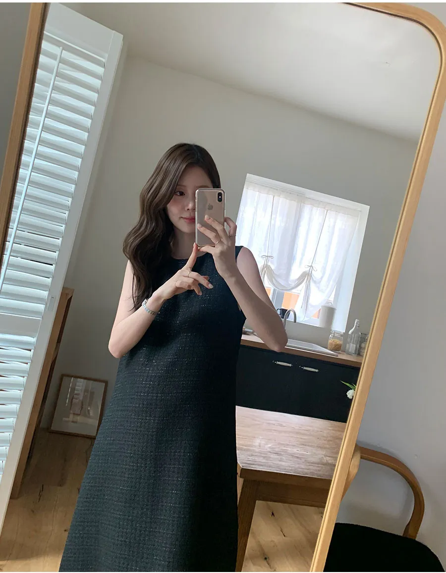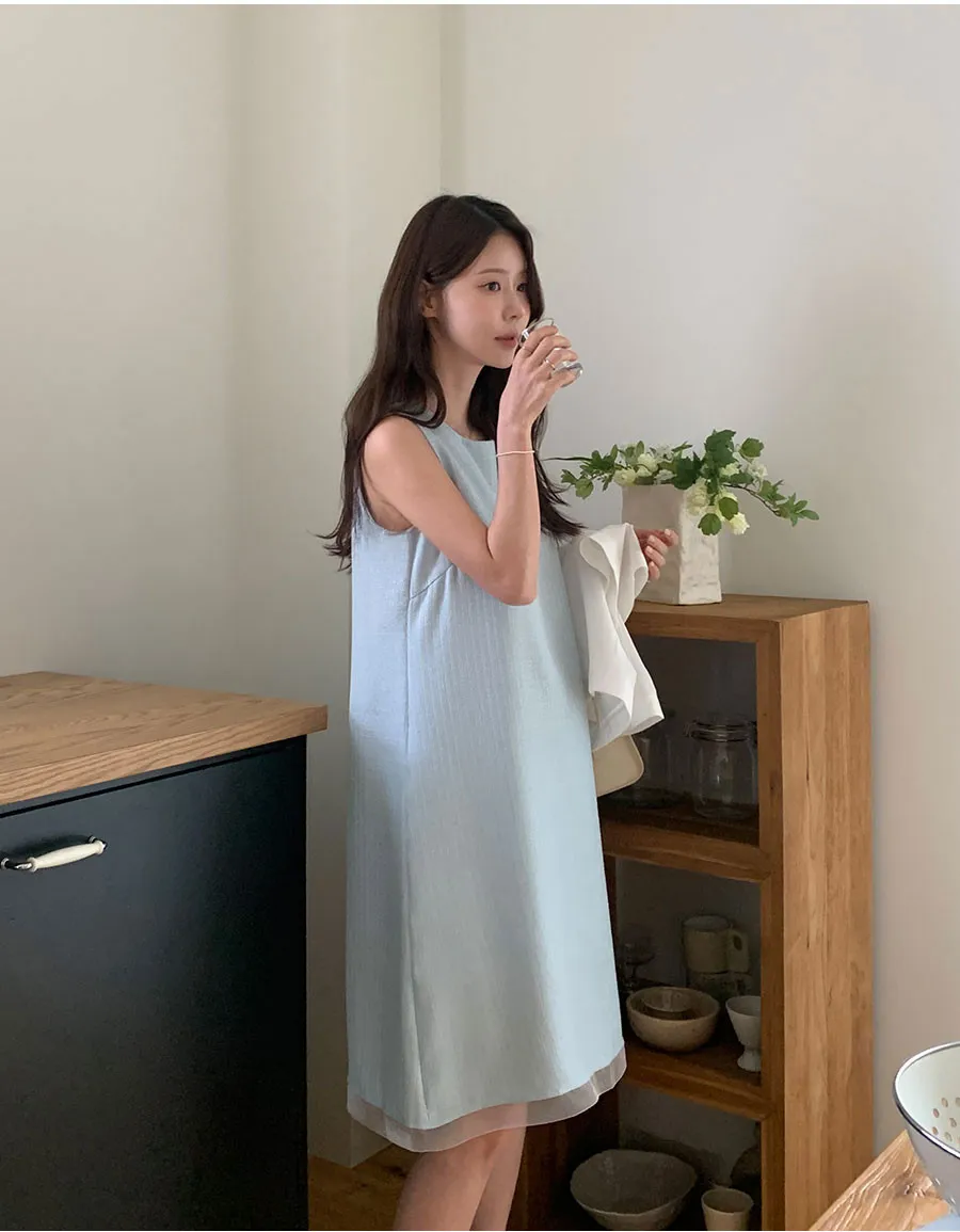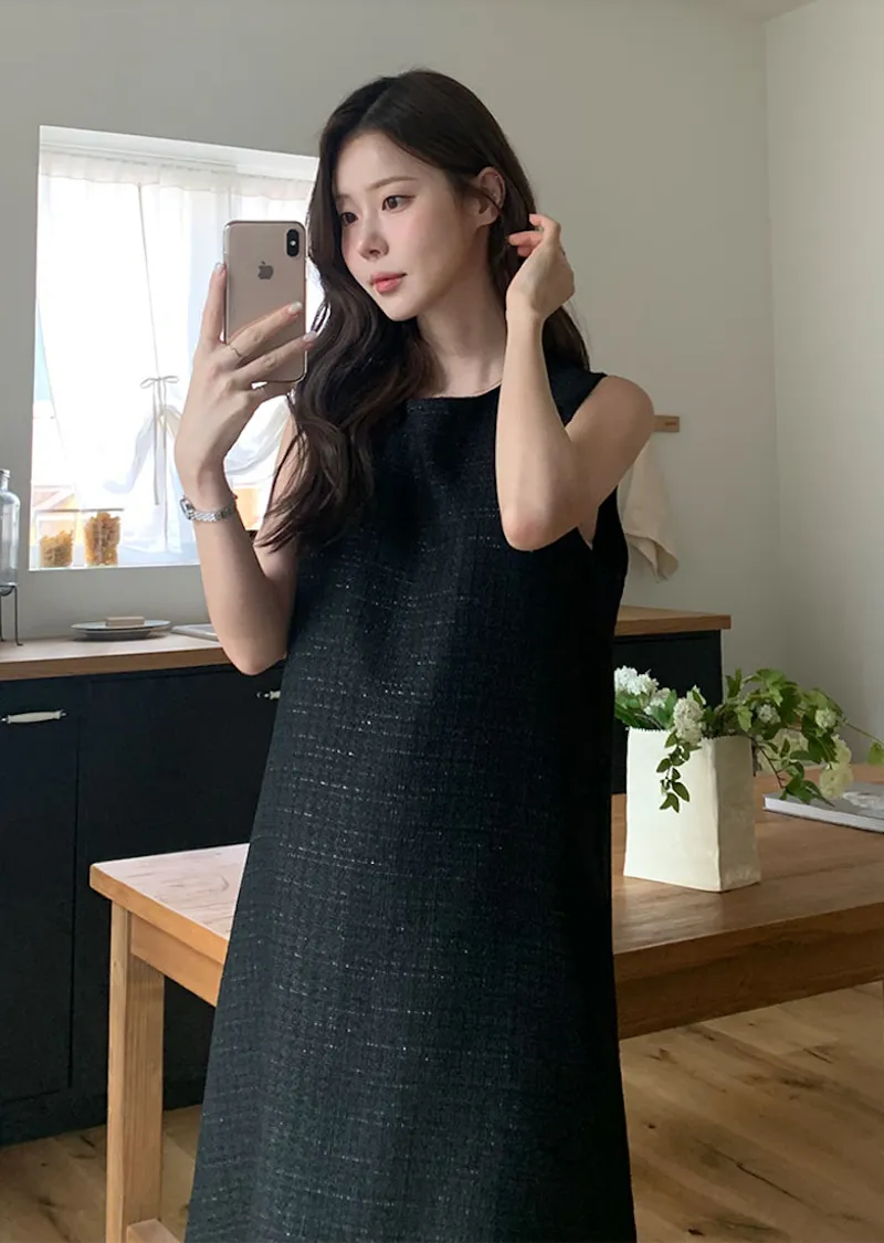 柔美下擺薄紗層疊A字輪廓無袖花呢連身裙