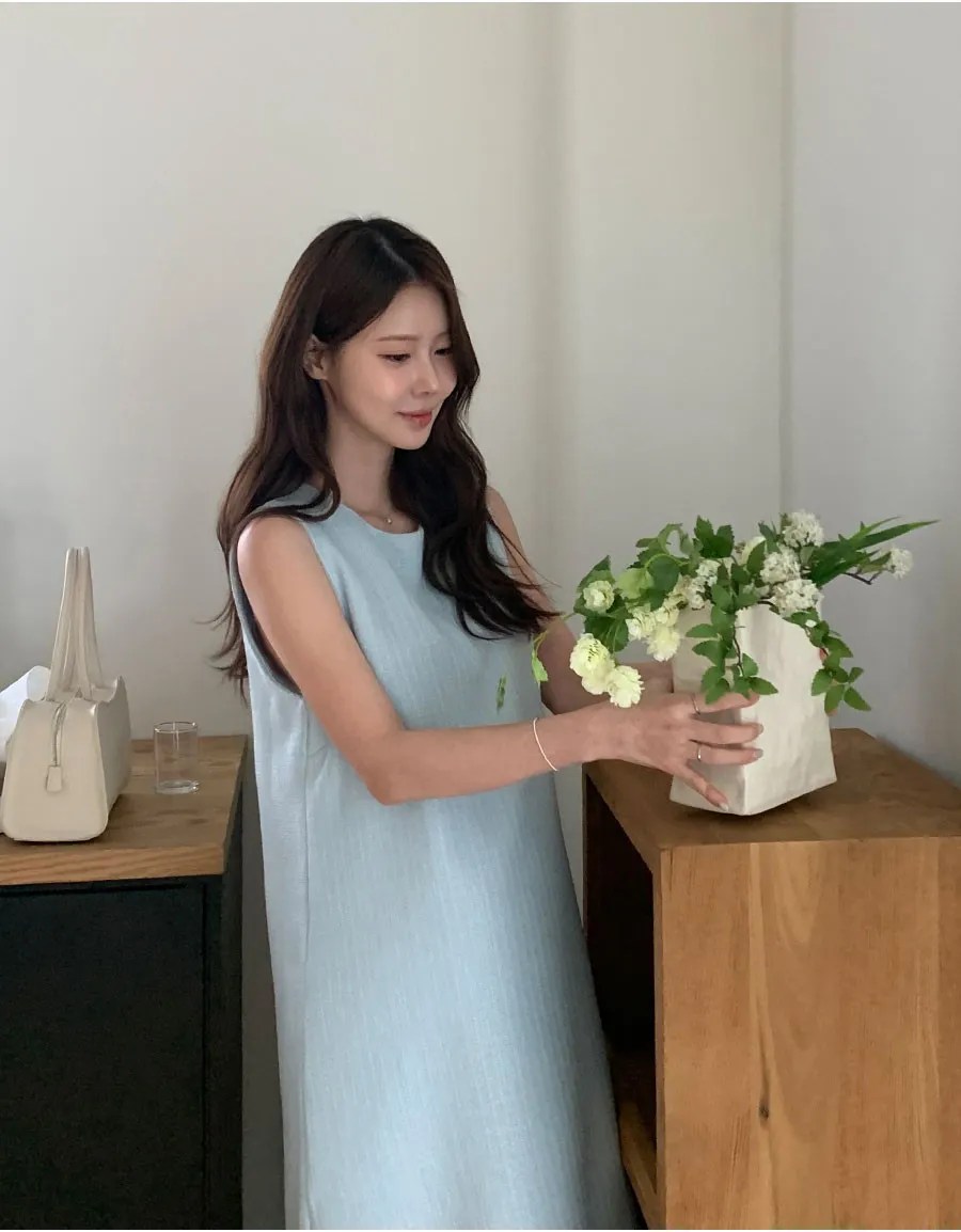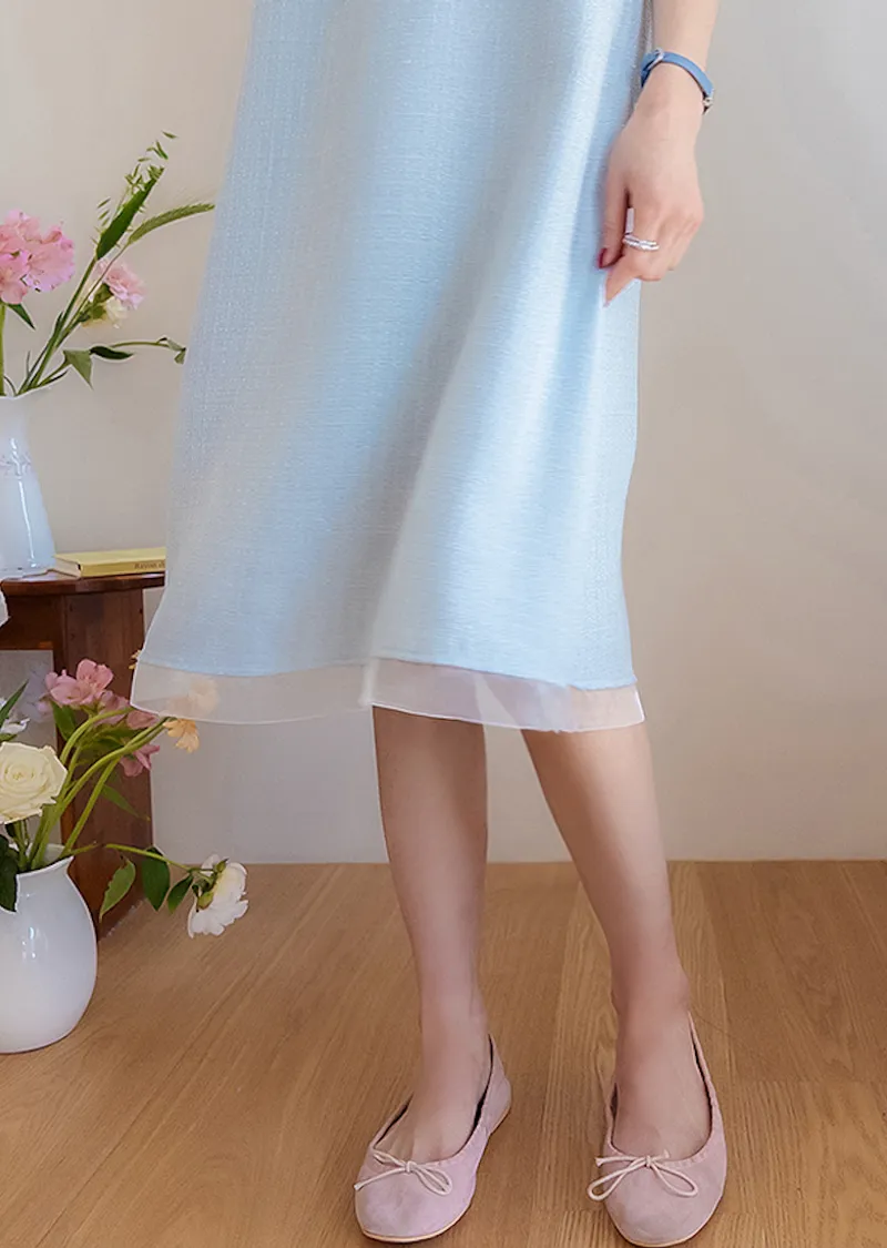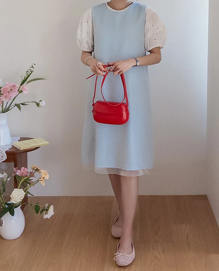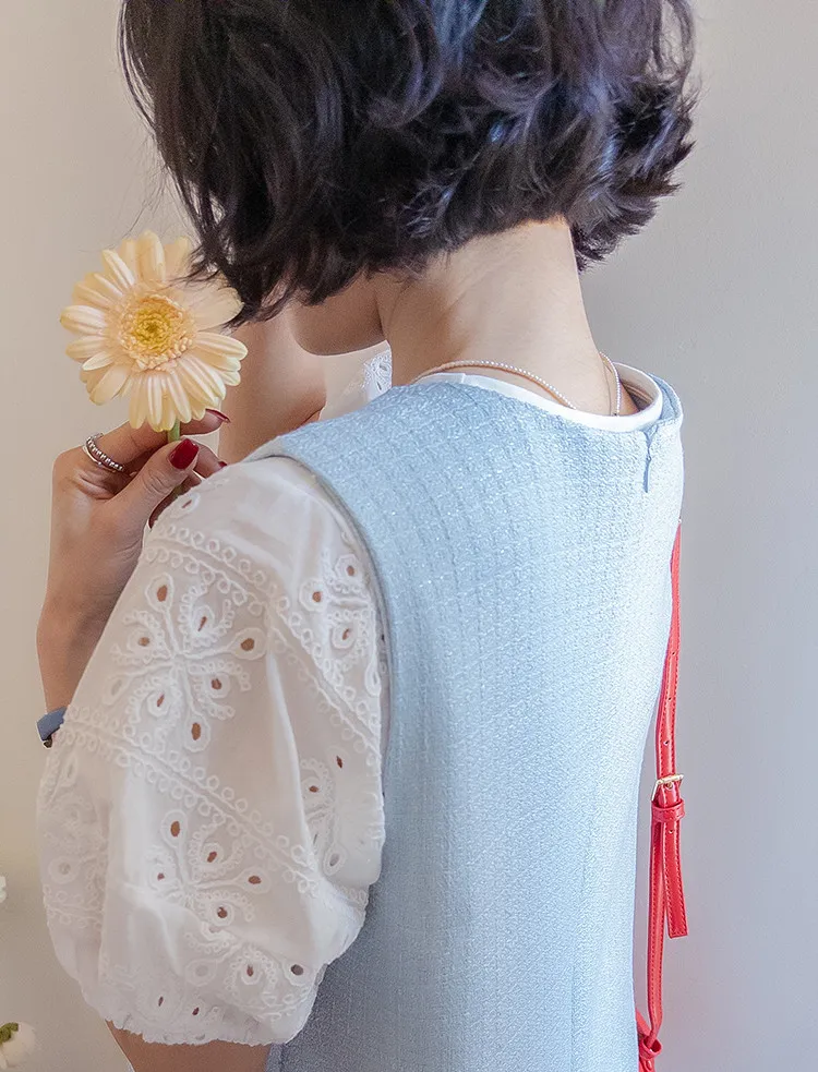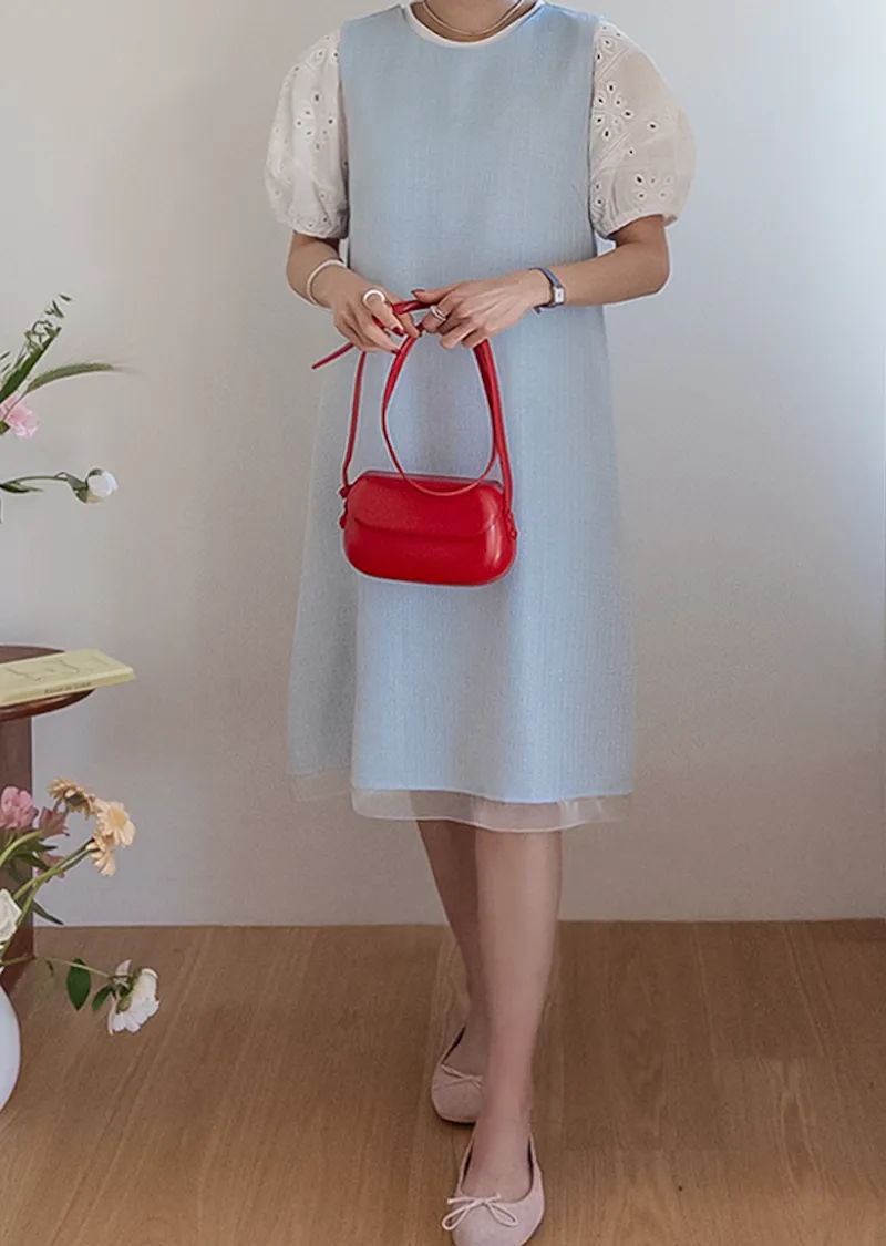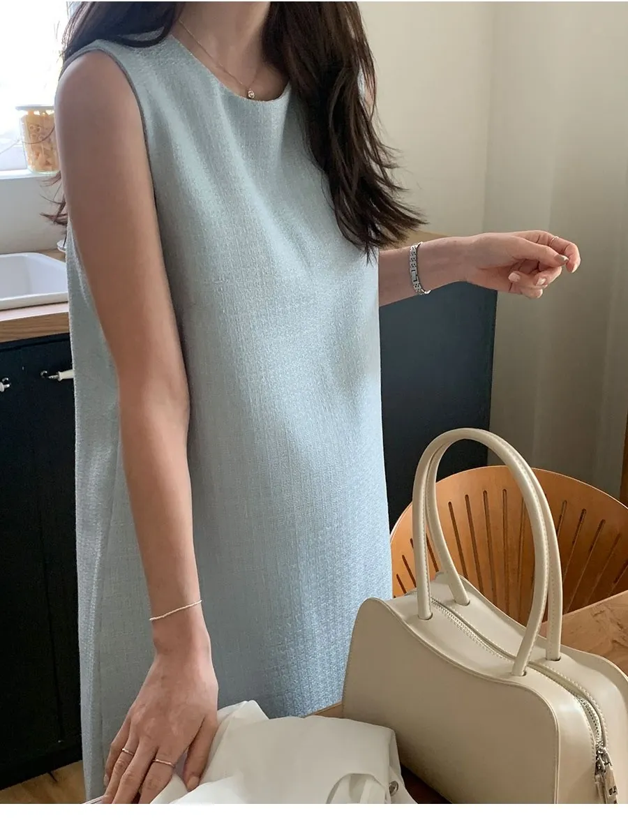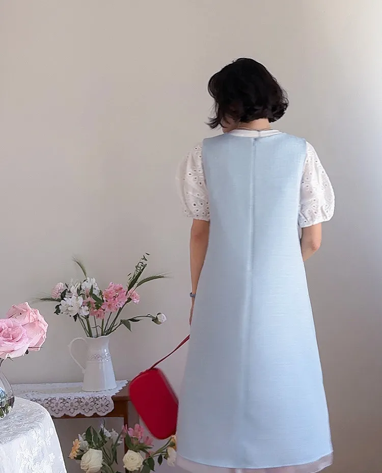 柔美下擺薄紗層疊A字輪廓無袖花呢連身裙