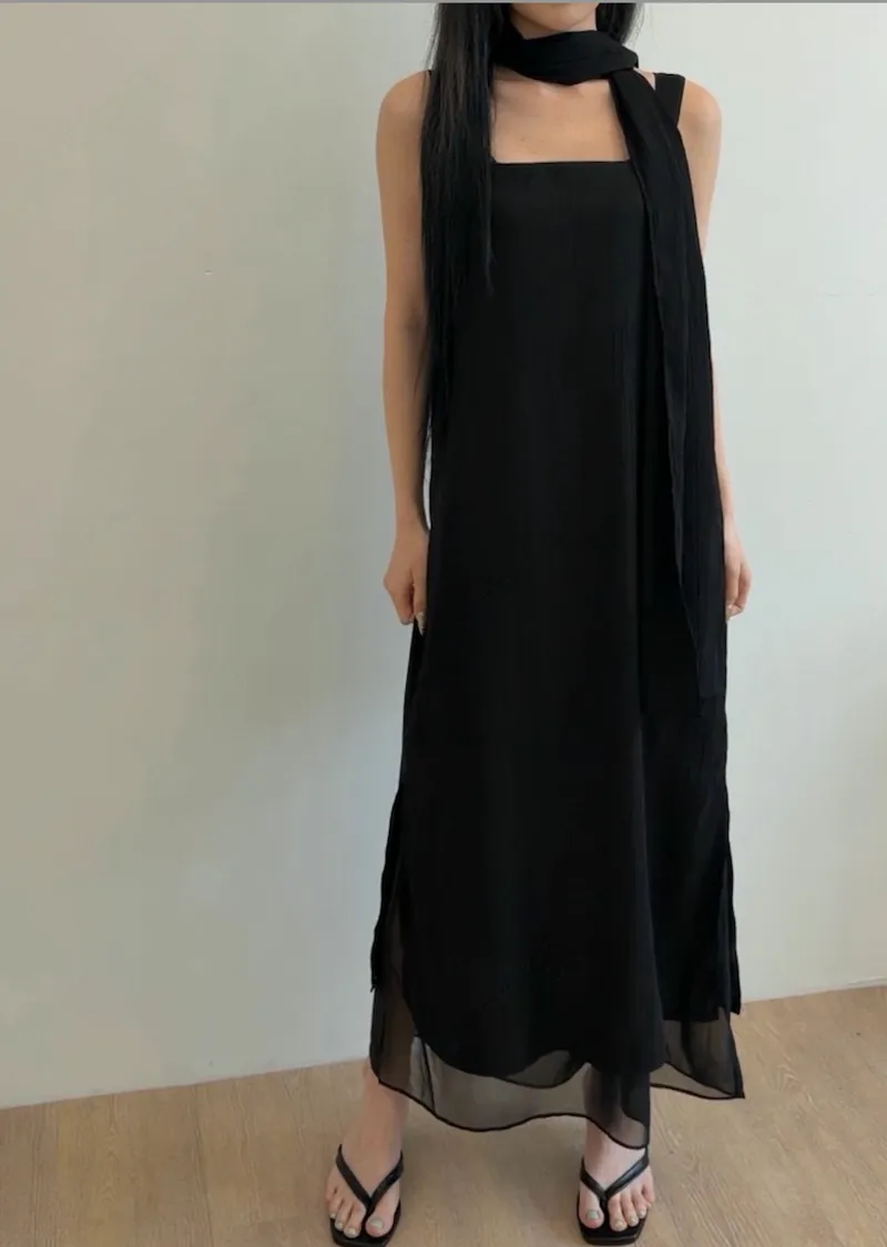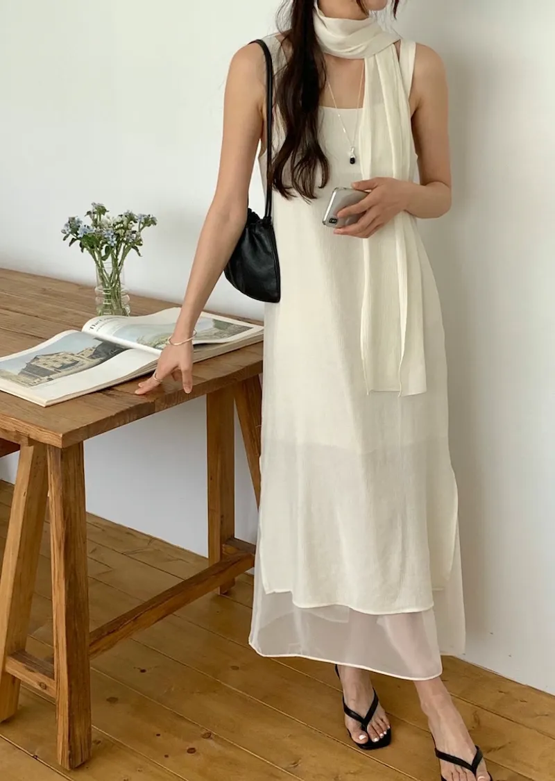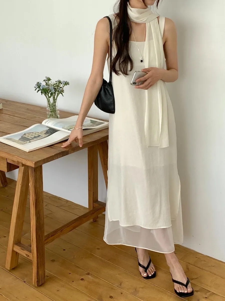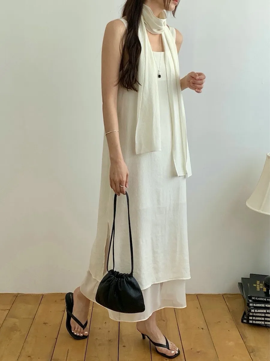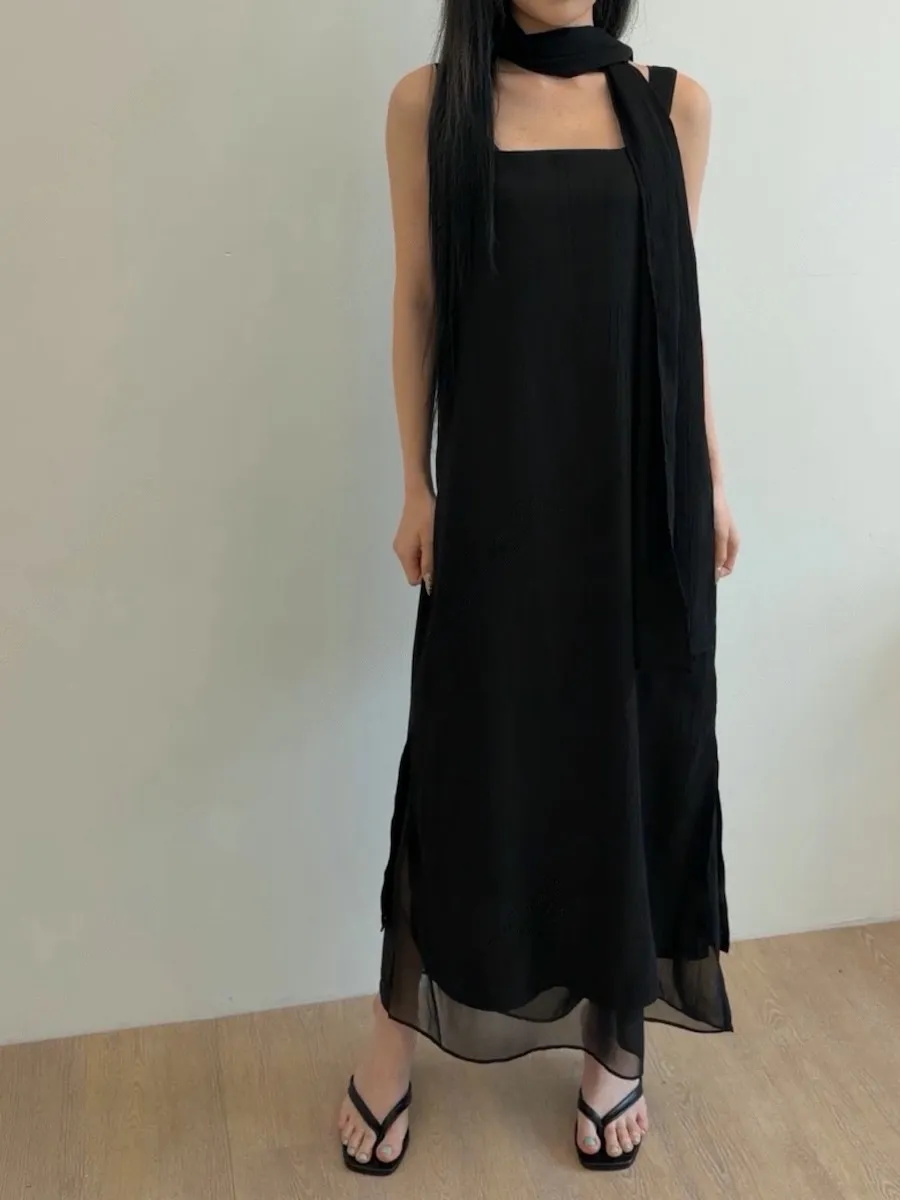 優雅簡潔剪裁下擺薄紗層疊附圍巾褶皺無袖連身裙