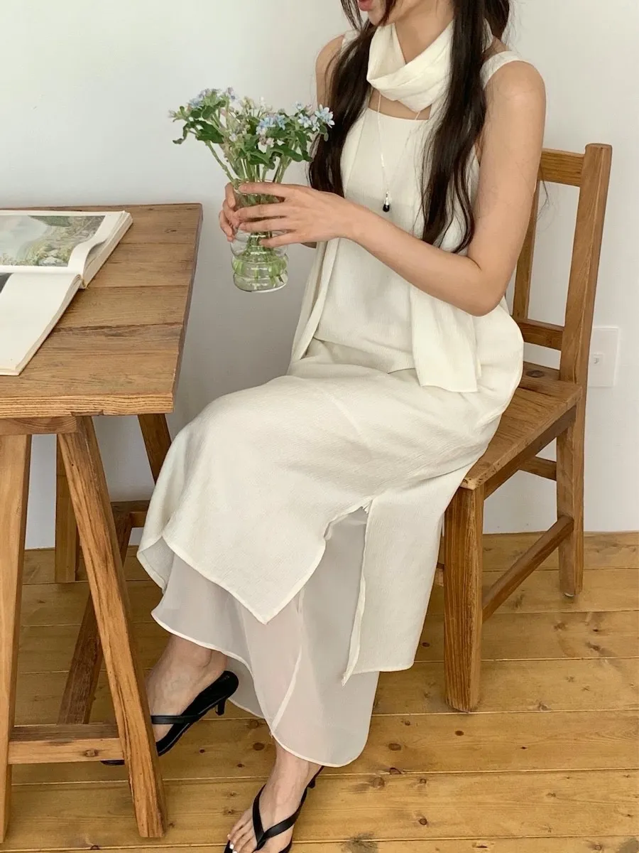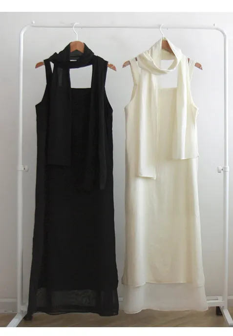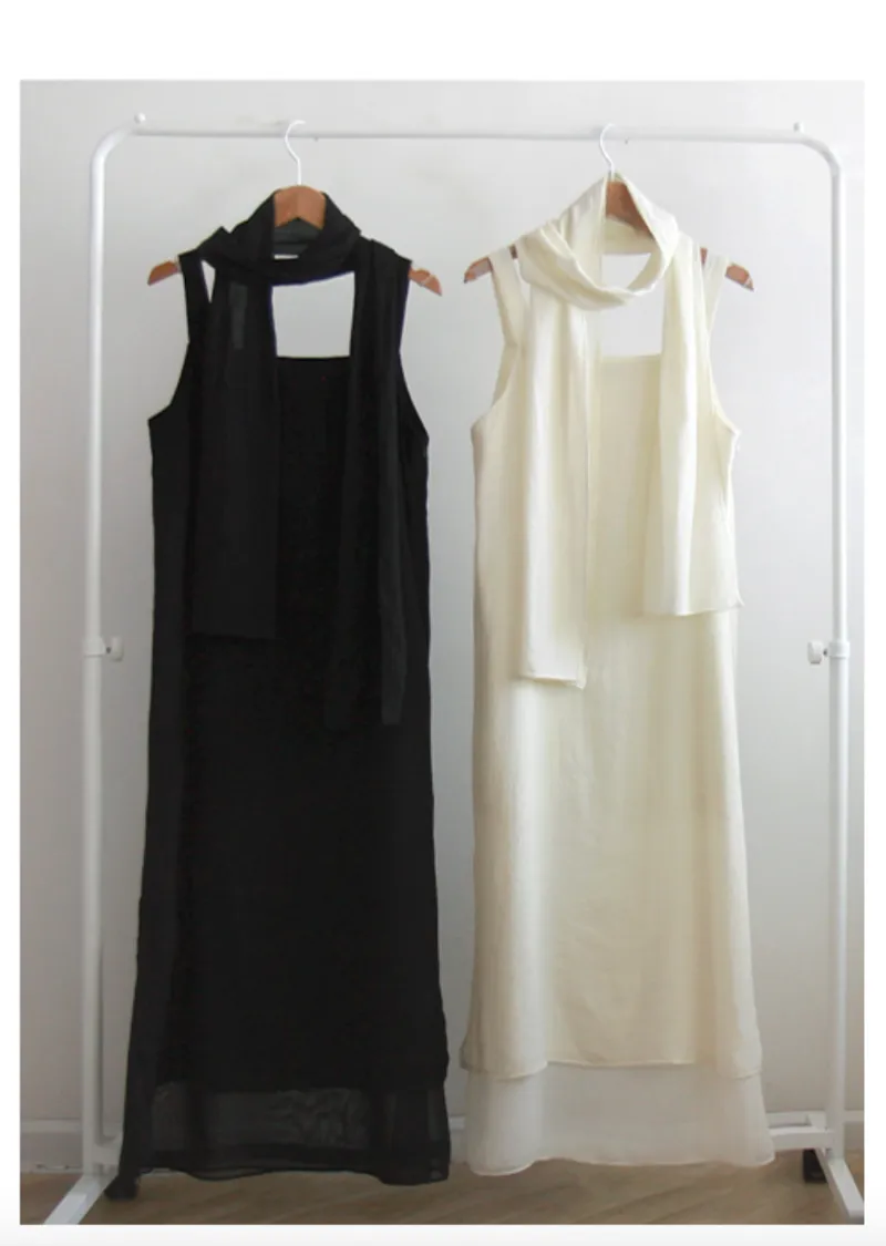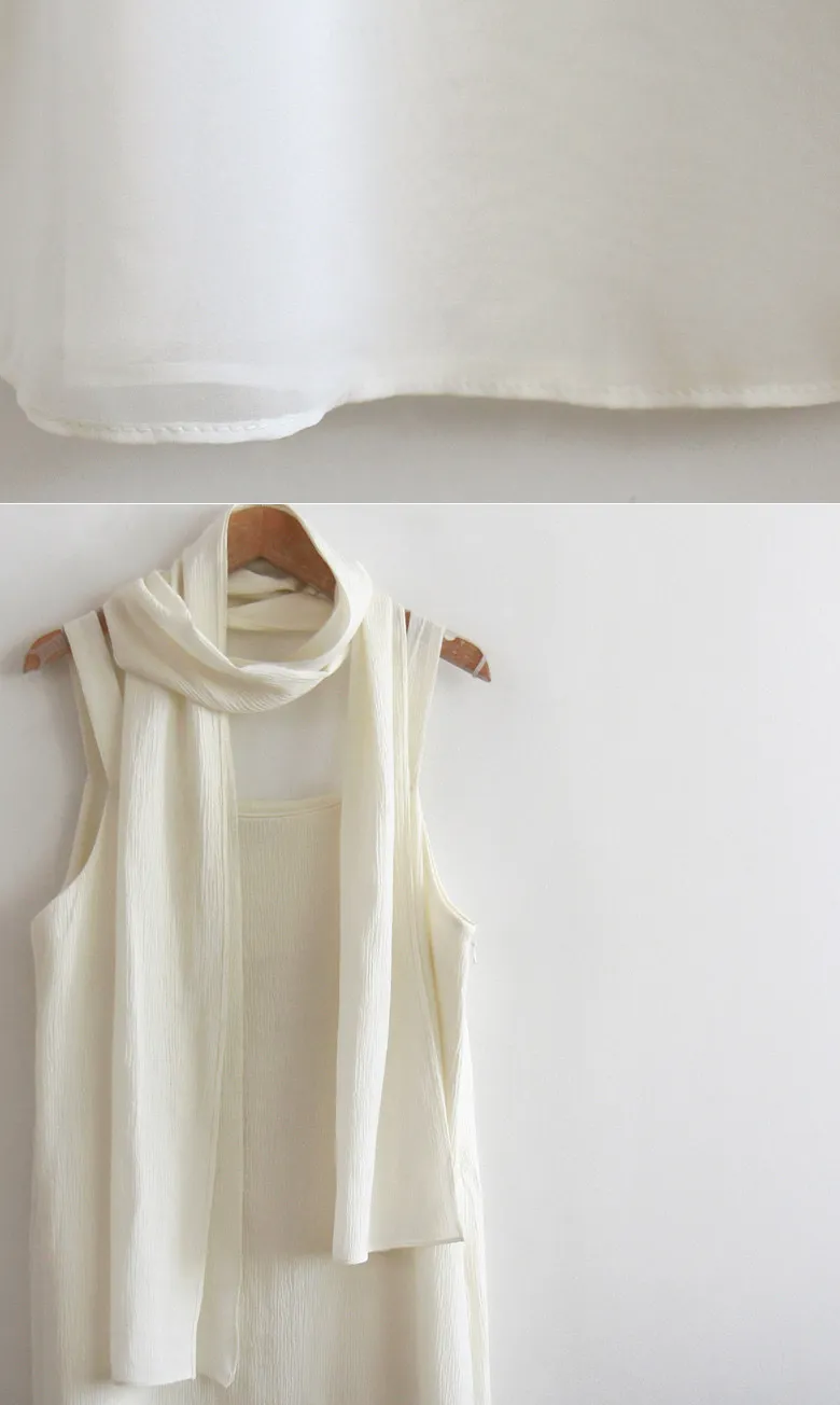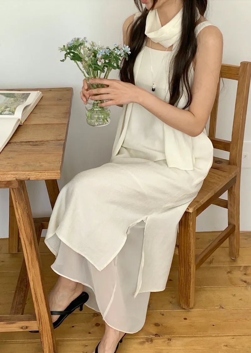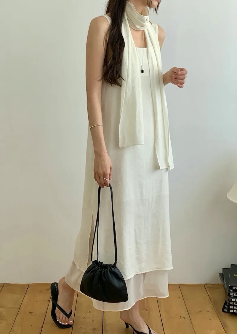 優雅簡潔剪裁下擺薄紗層疊附圍巾褶皺無袖連身裙