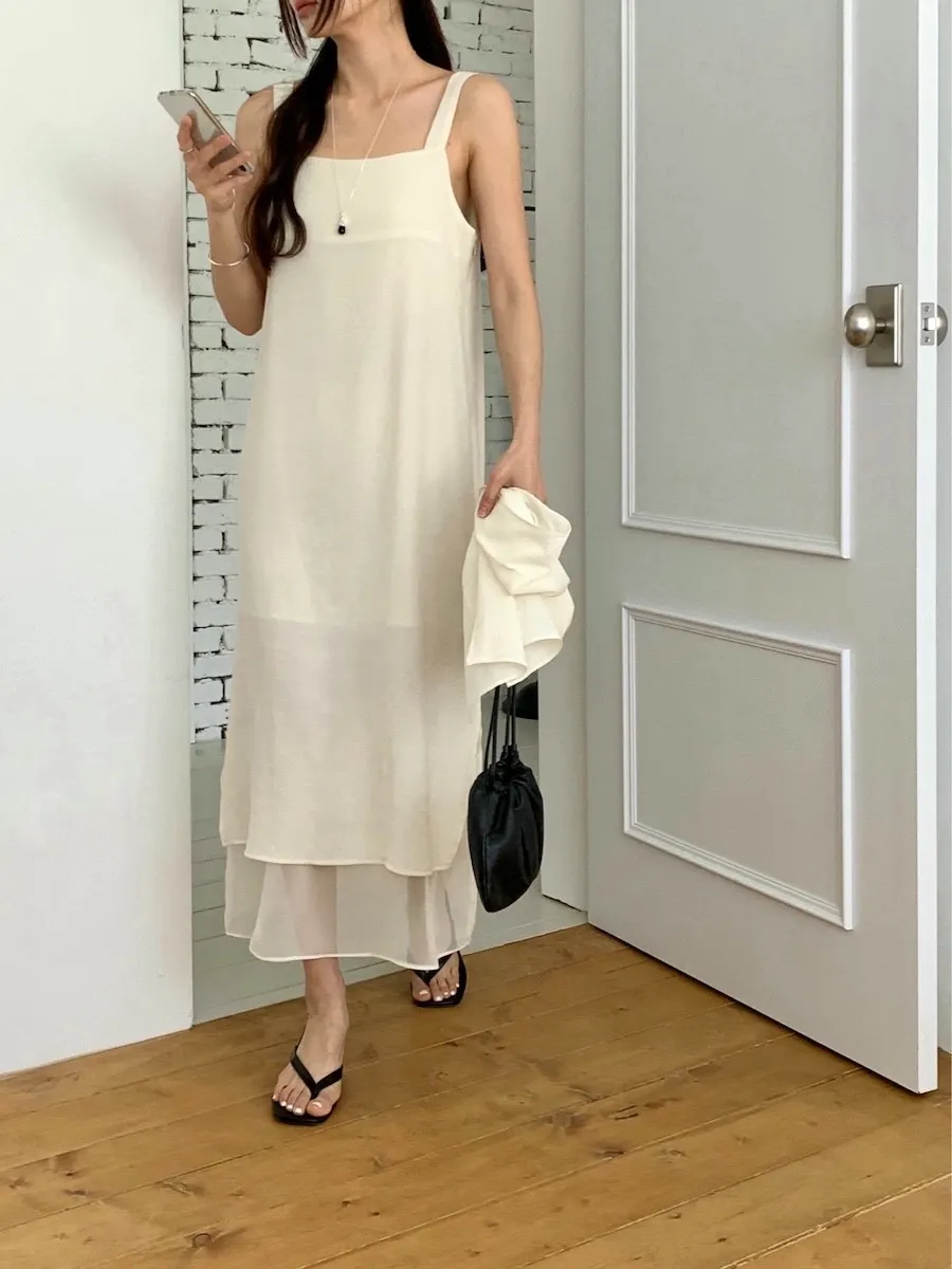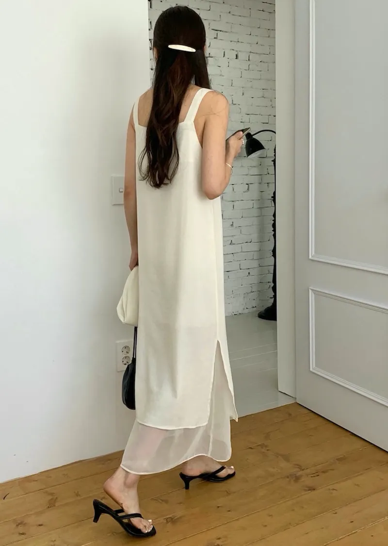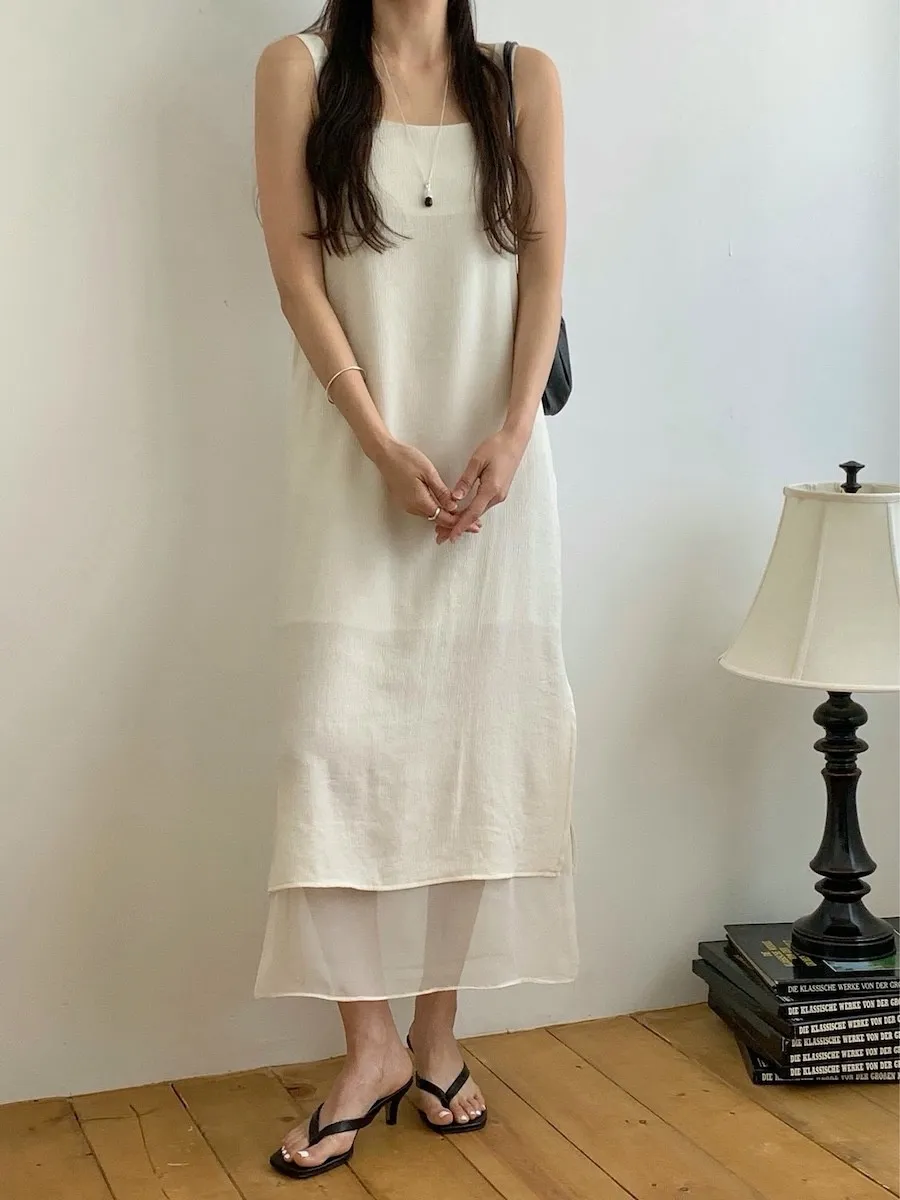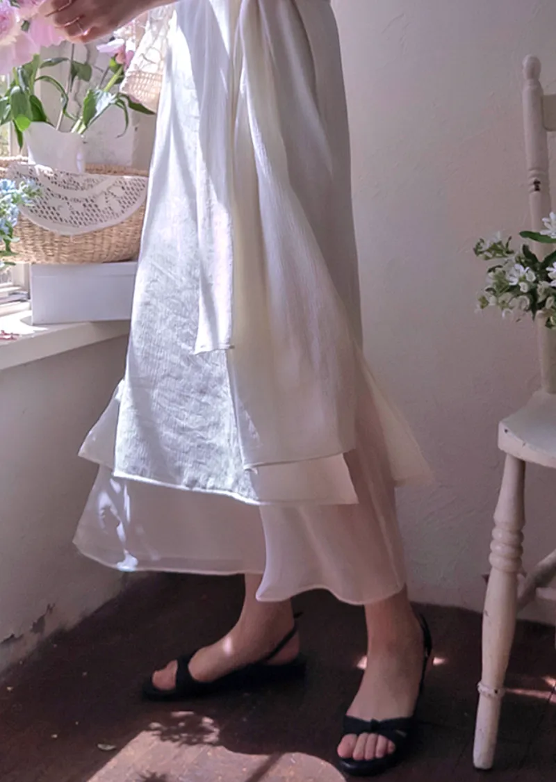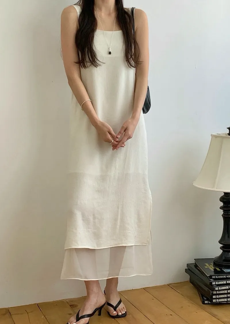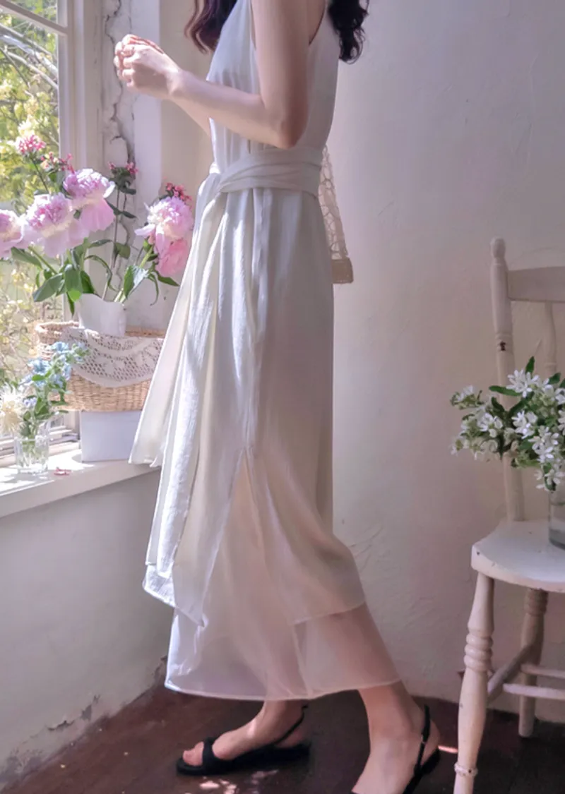 優雅簡潔剪裁下擺薄紗層疊附圍巾褶皺無袖連身裙