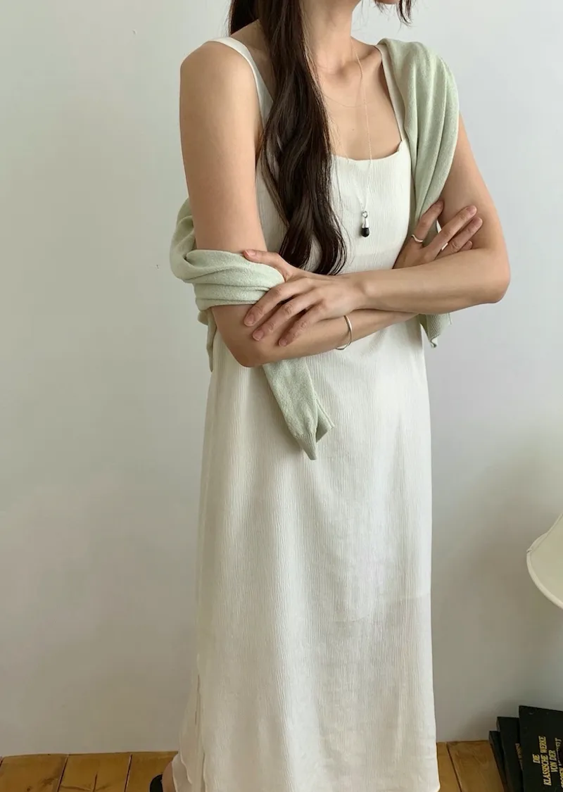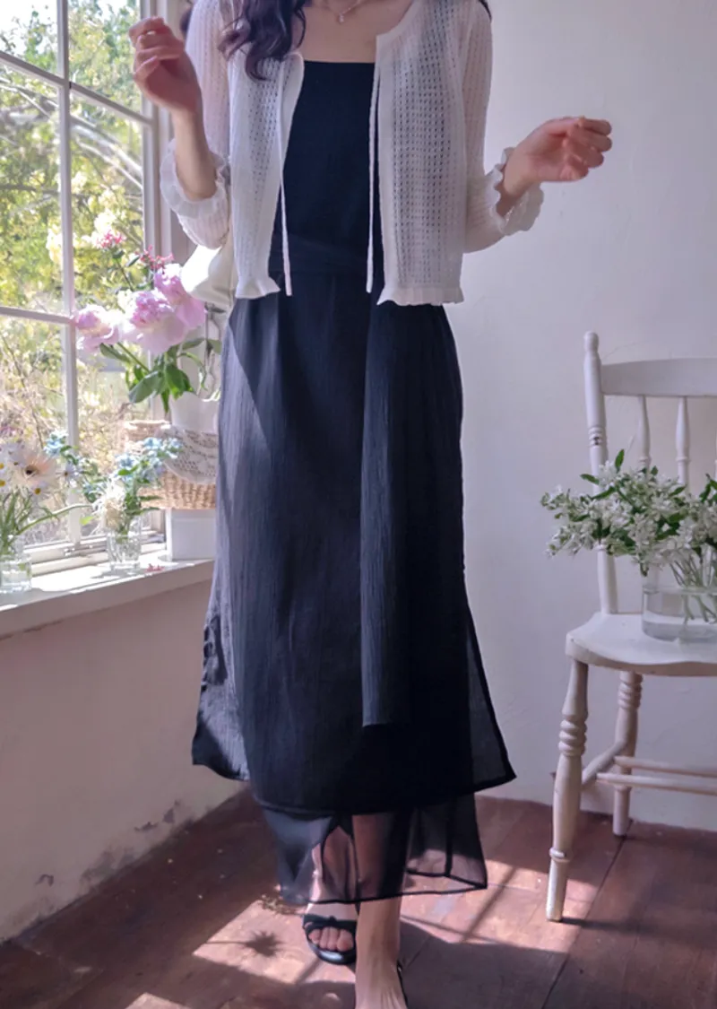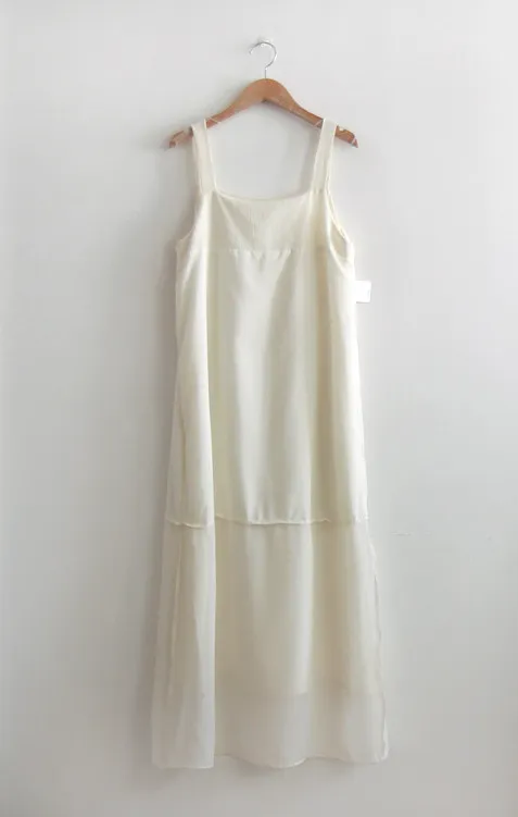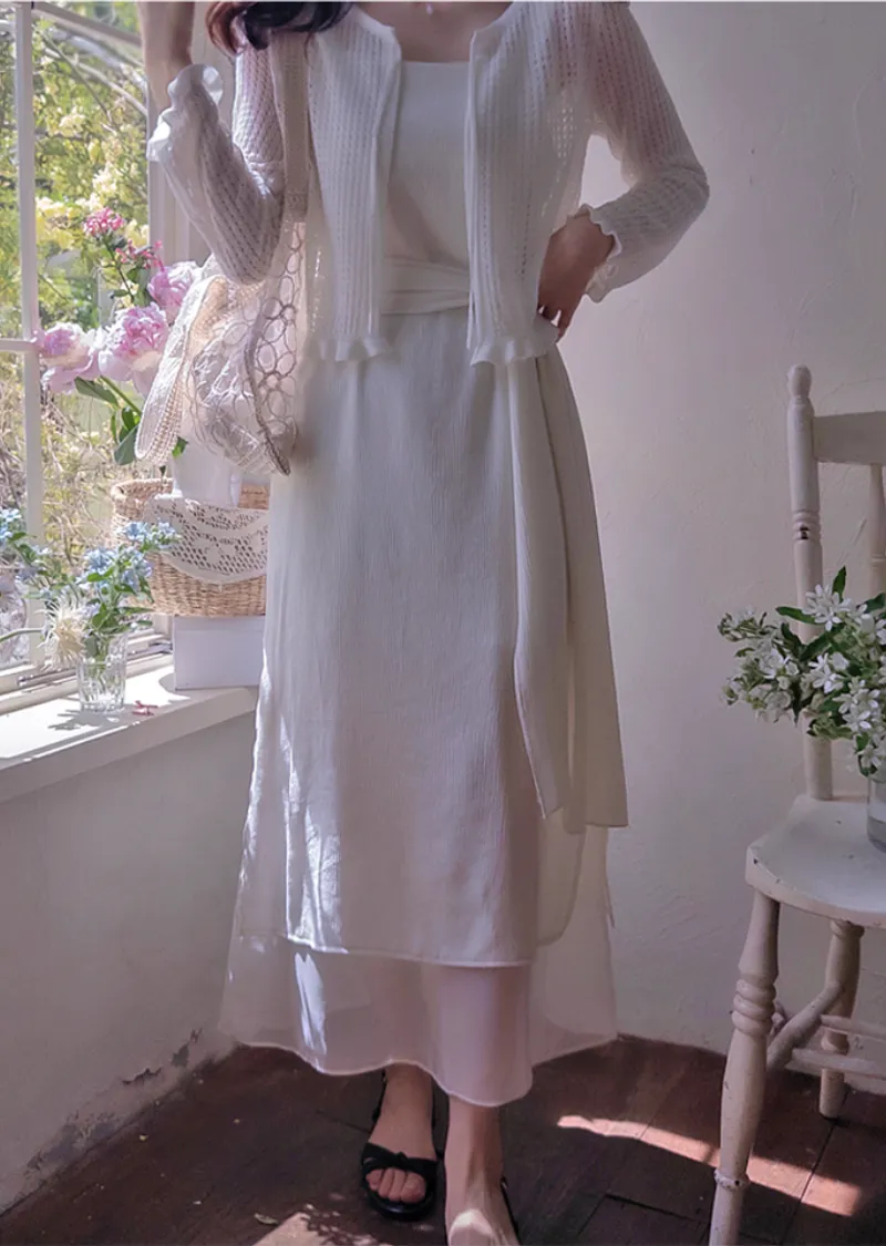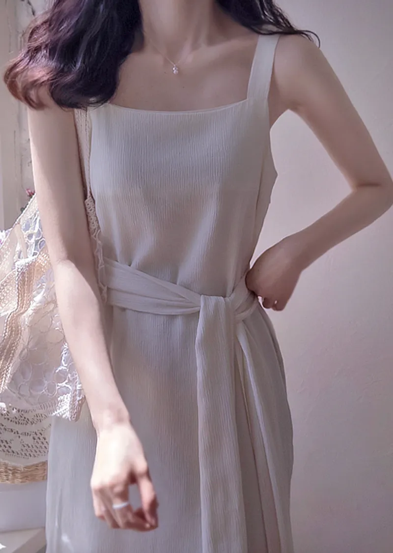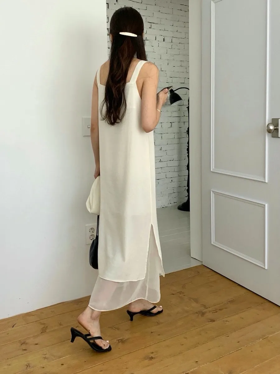 優雅簡潔剪裁下擺薄紗層疊附圍巾褶皺無袖連身裙