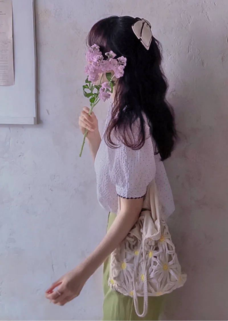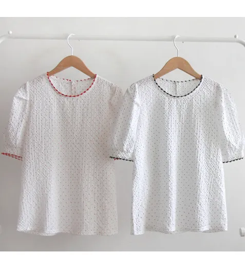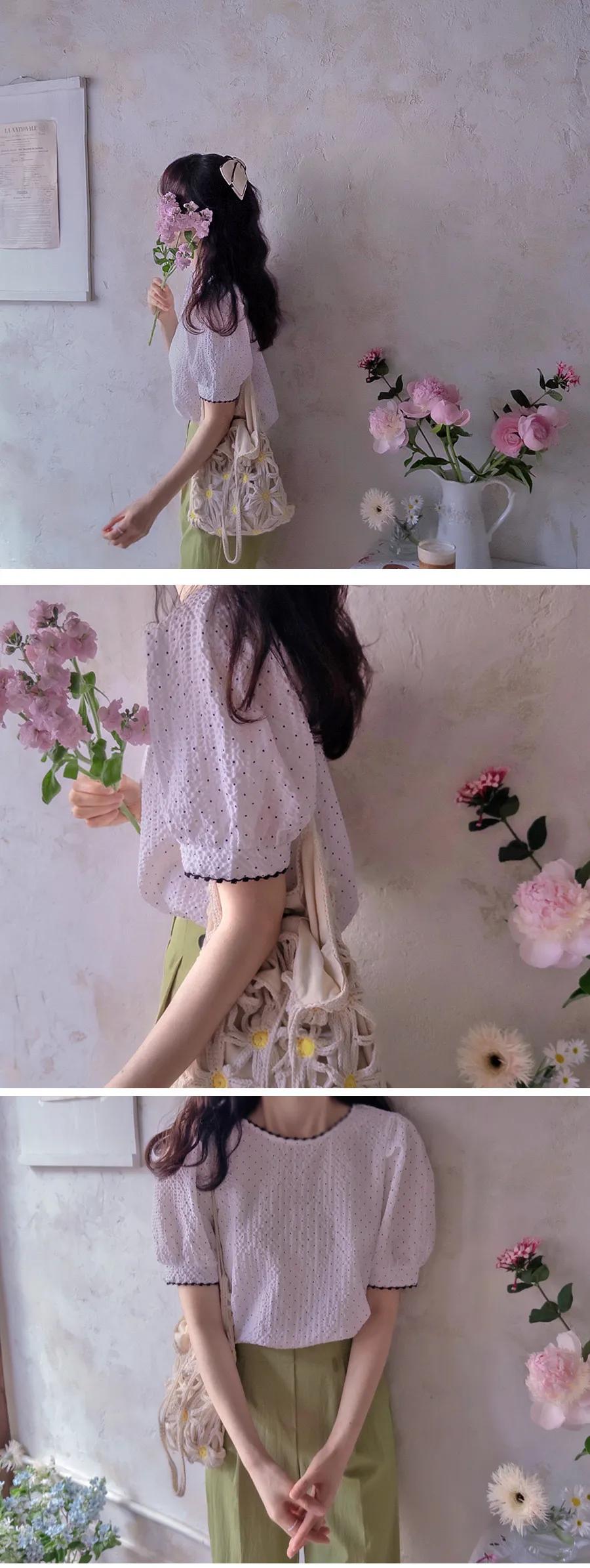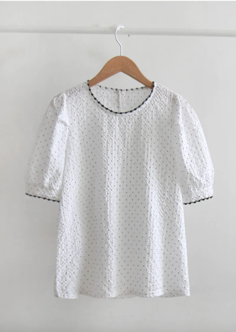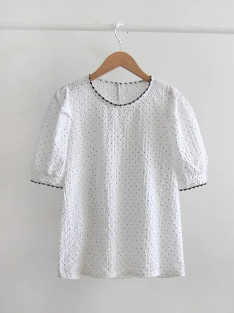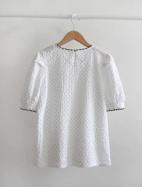 【領口與袖口飾有精美刺繡的可愛上衣】【輕盈舒適不易起皺】【清新小圓點圖案】【肩部獨特褶皺設計】【優雅甜美,是夏季的理想之選】