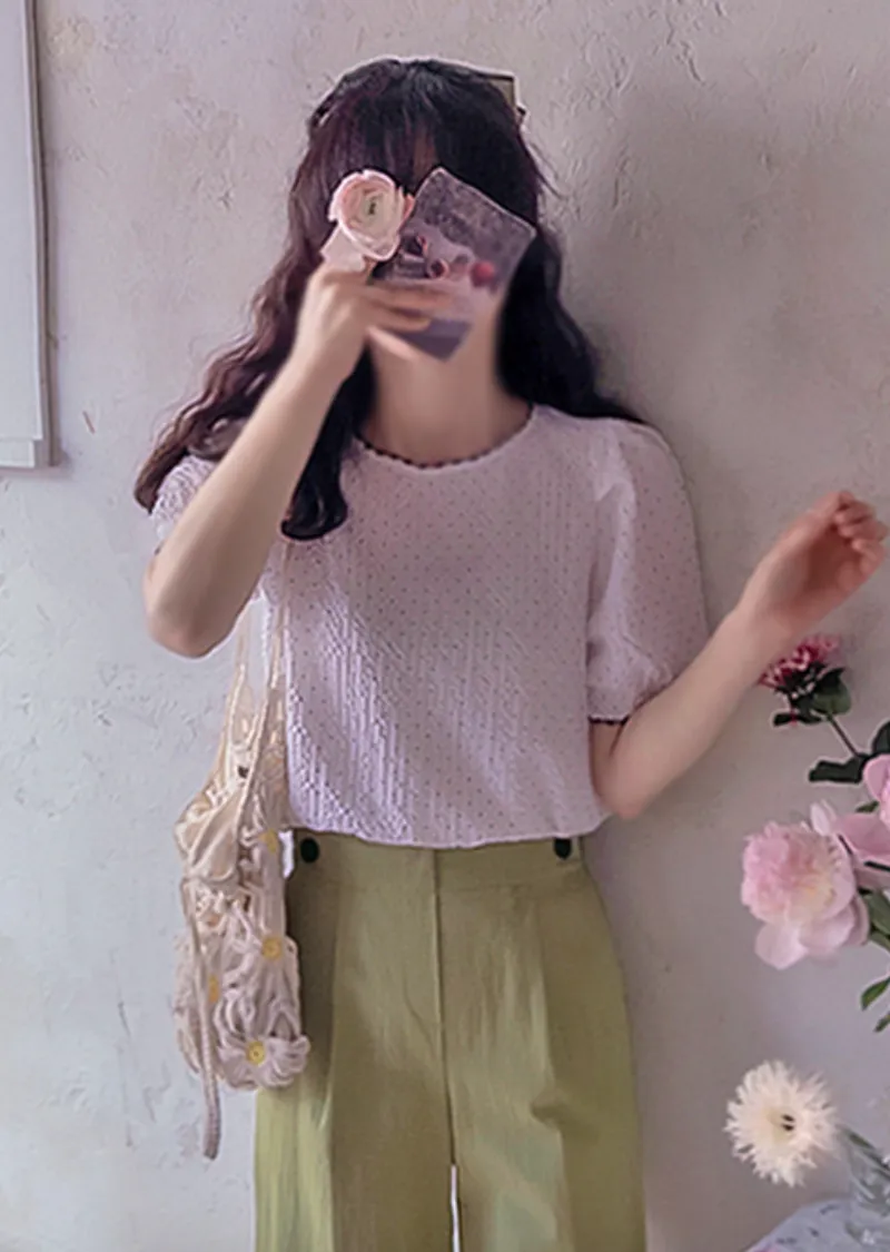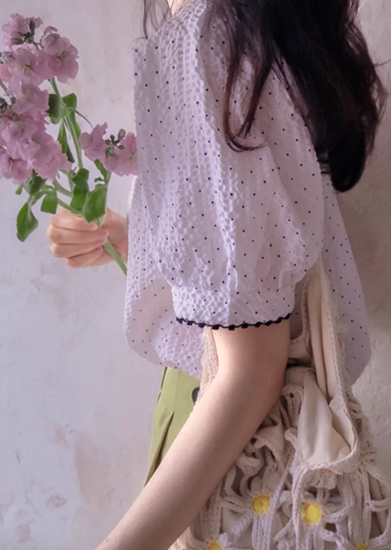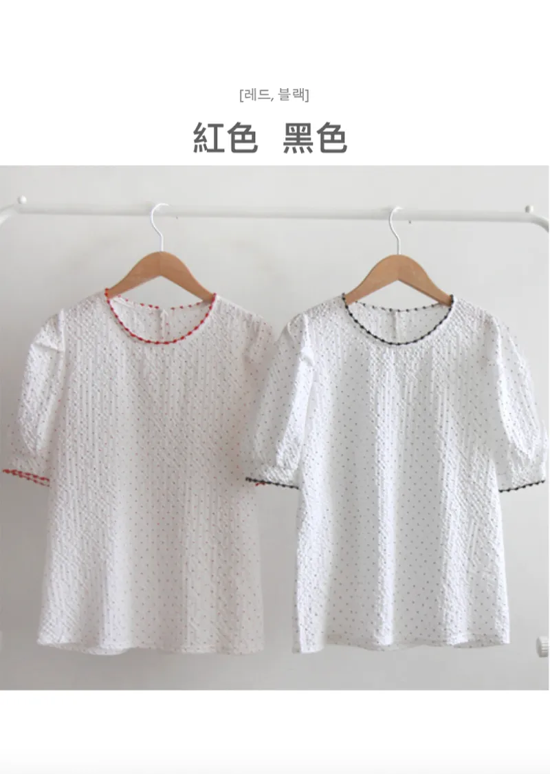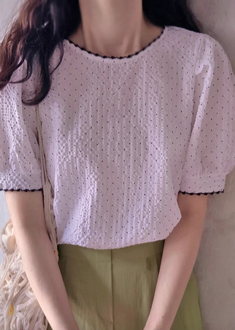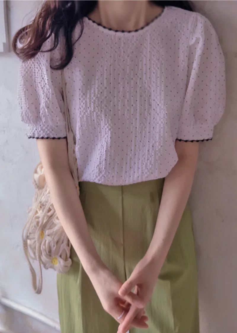 清新領口袖末刺繡邊小圓點點皺摺上衣