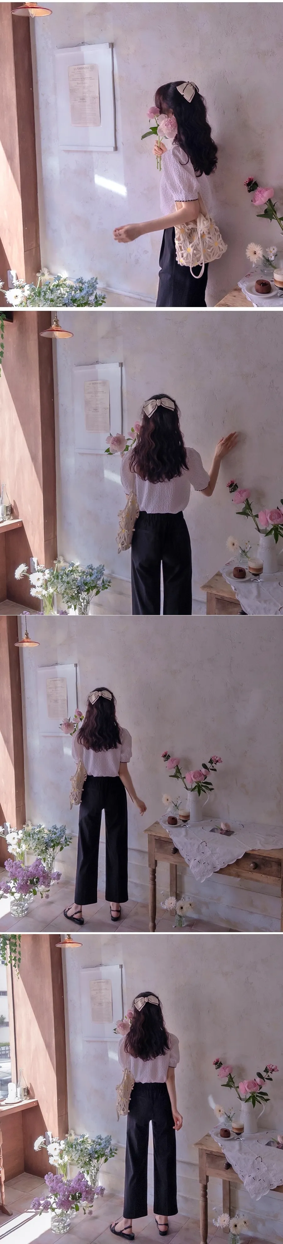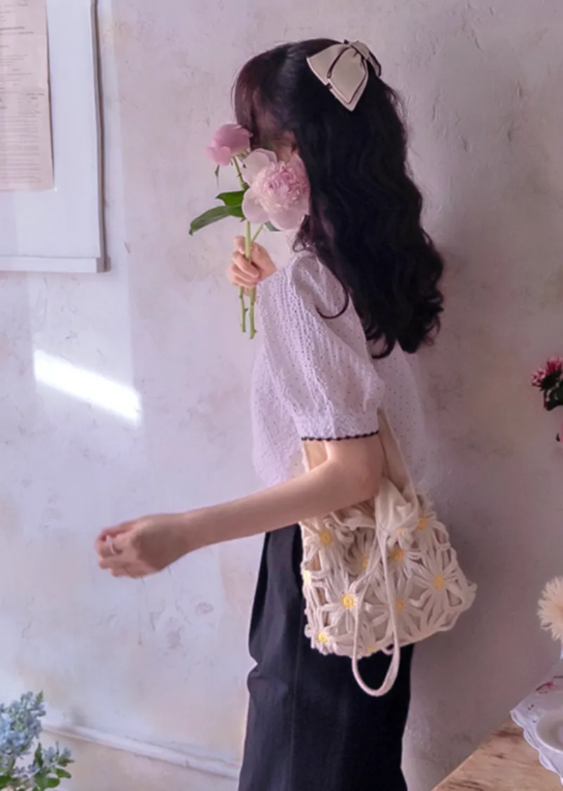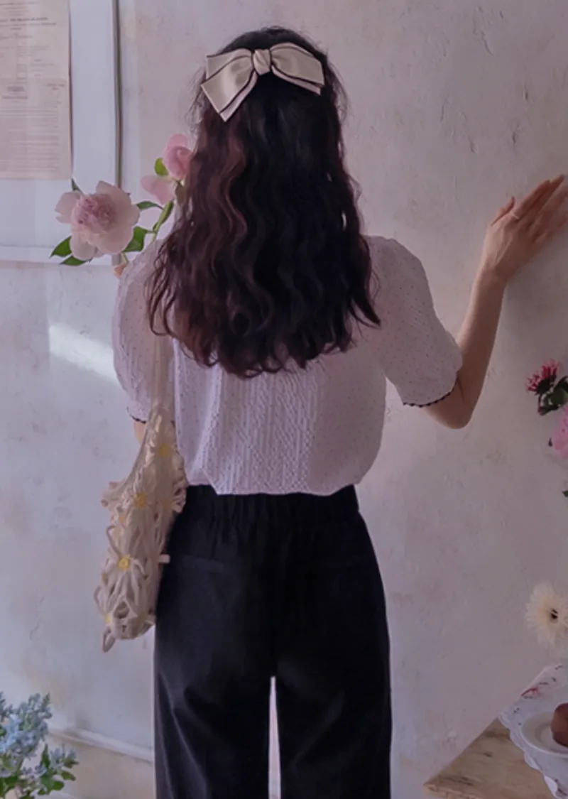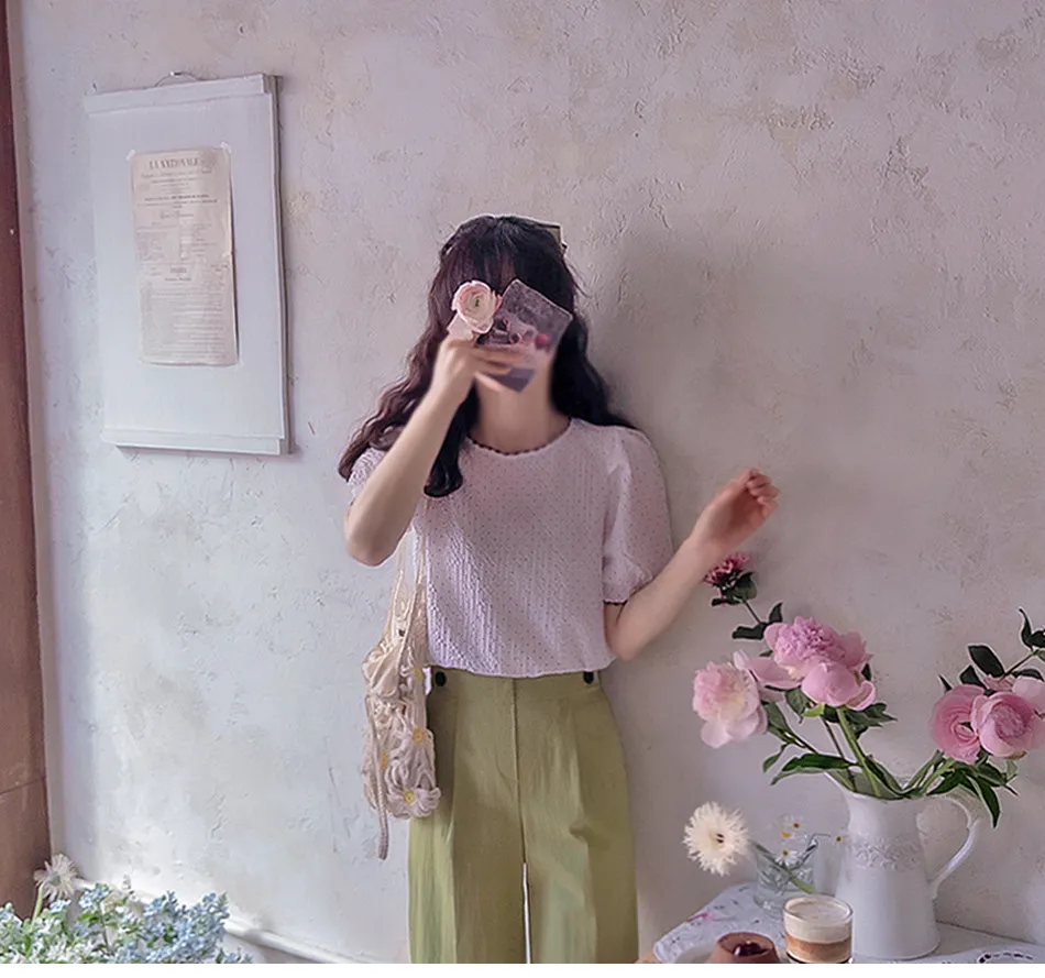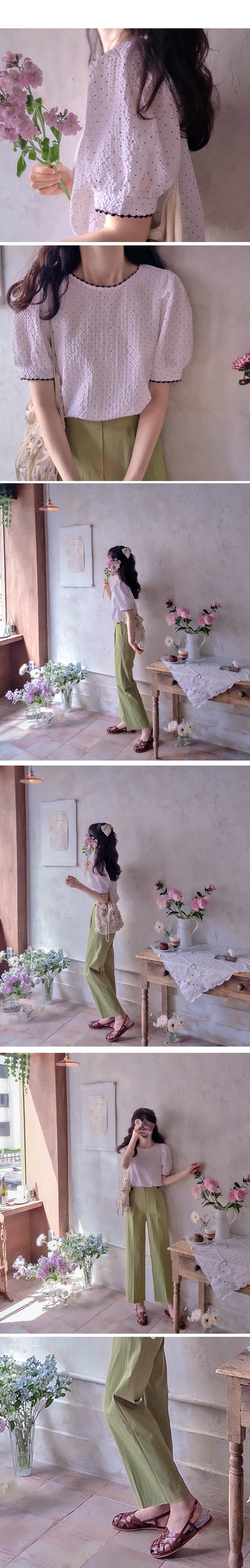 清新領口袖末刺繡邊小圓點點皺摺上衣