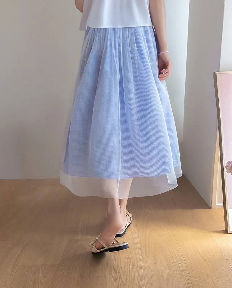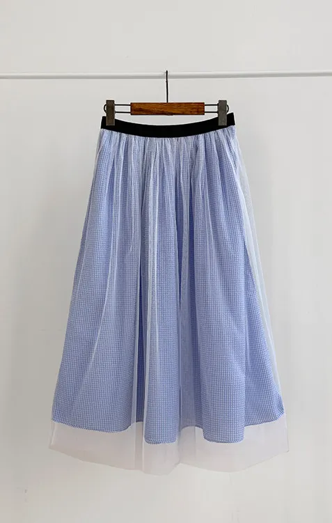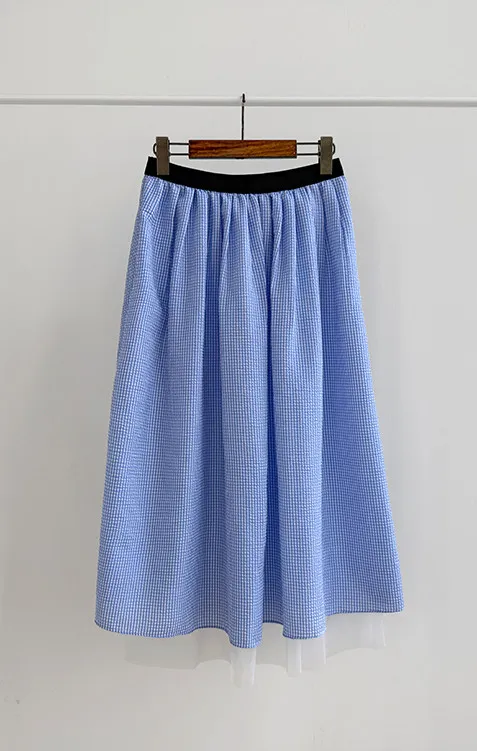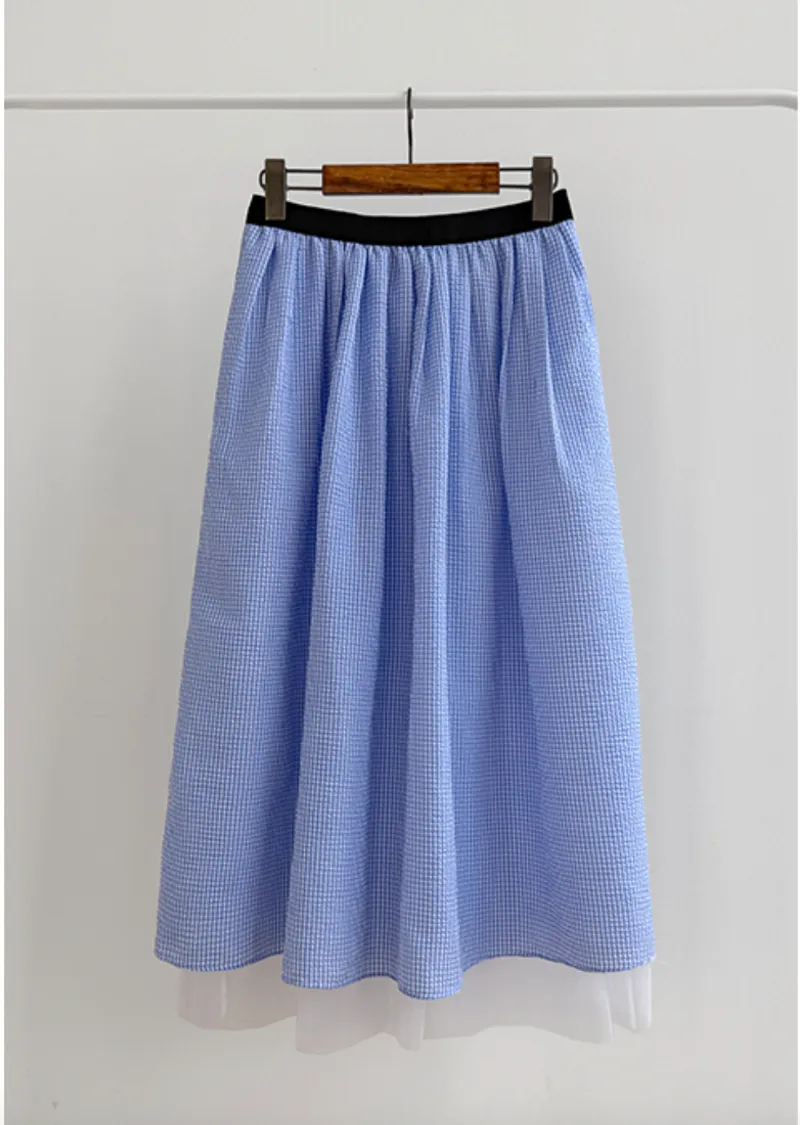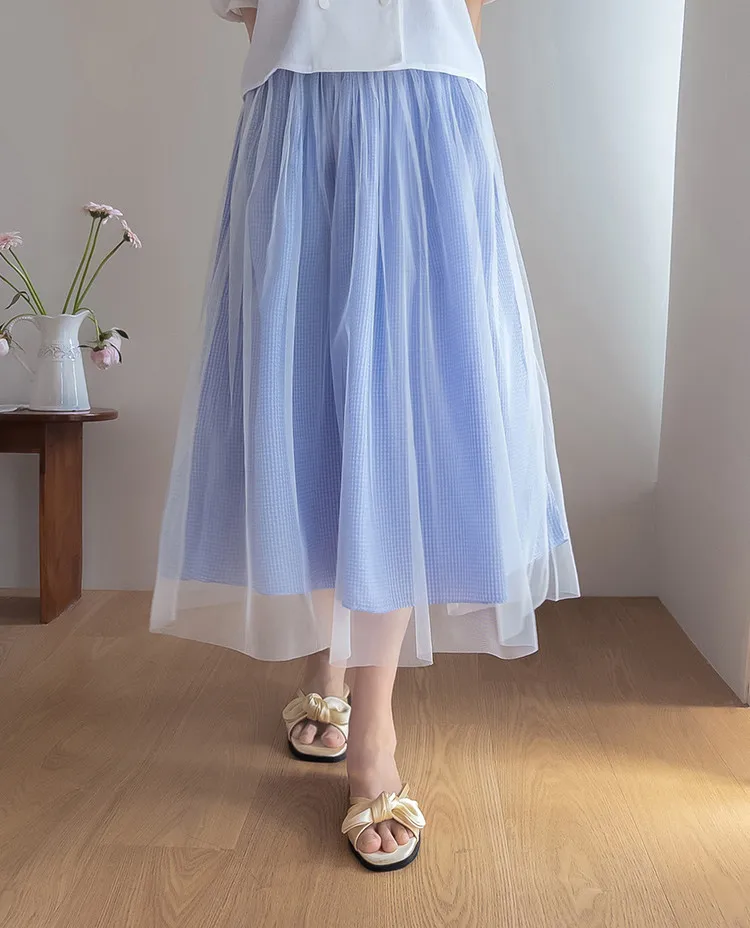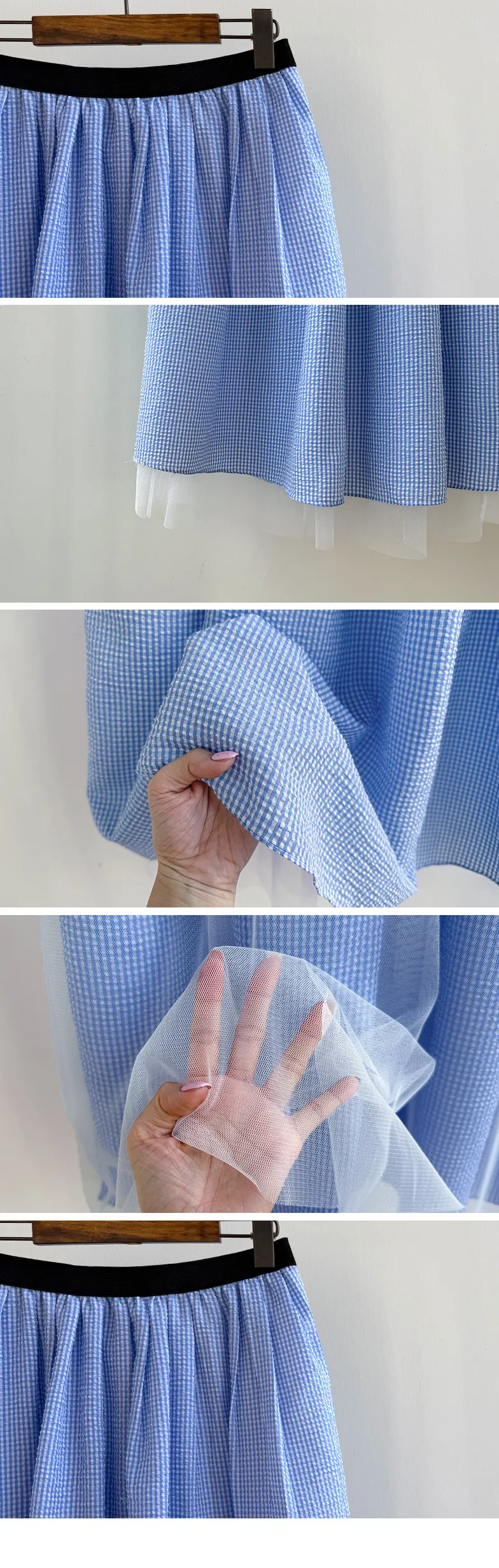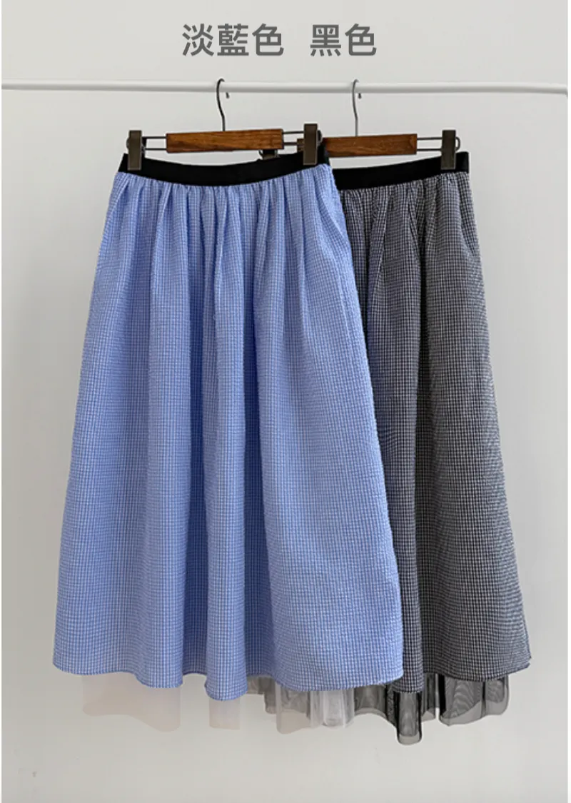 【雙面設計,兩面各具特色】【精緻格紋布料與輕款網紗布料巧妙融合】【長款網紗下擺,增添精緻感】【配色彈性腰帶,穿著舒適】