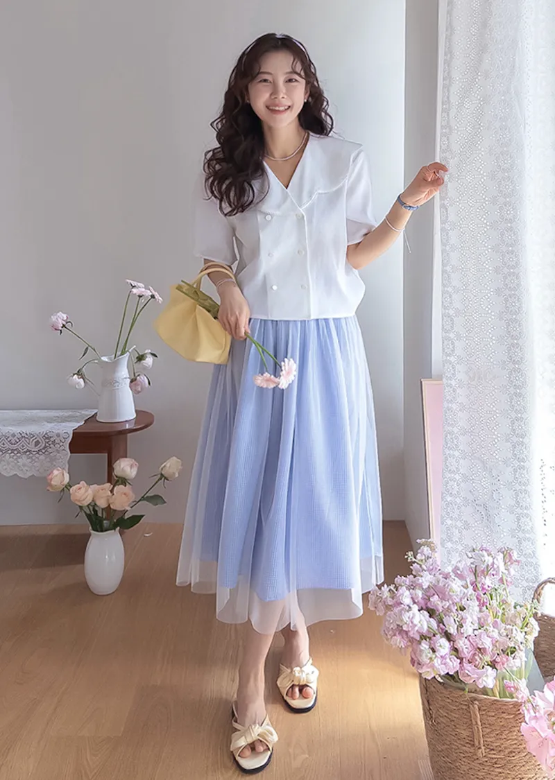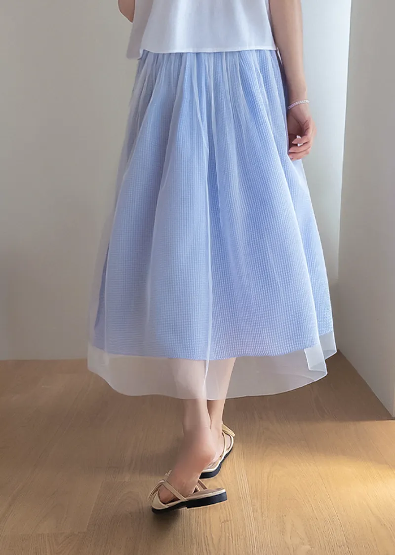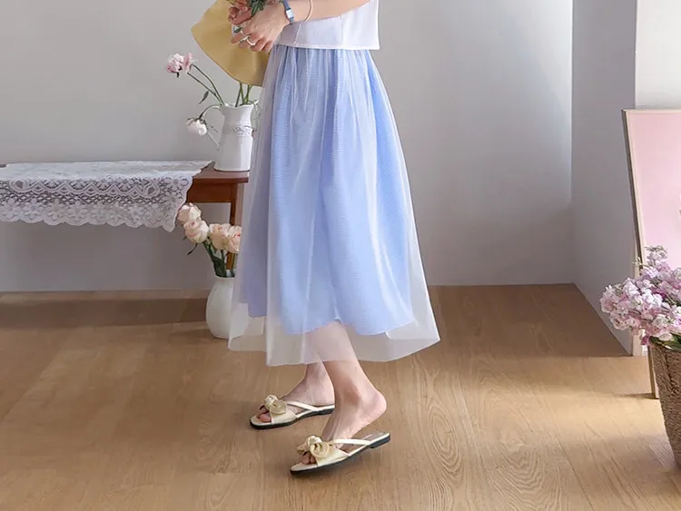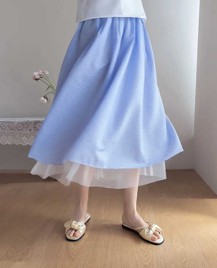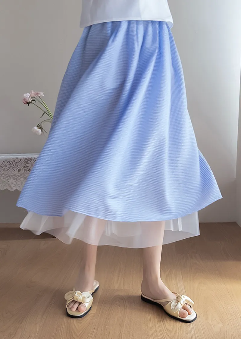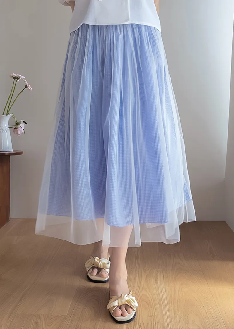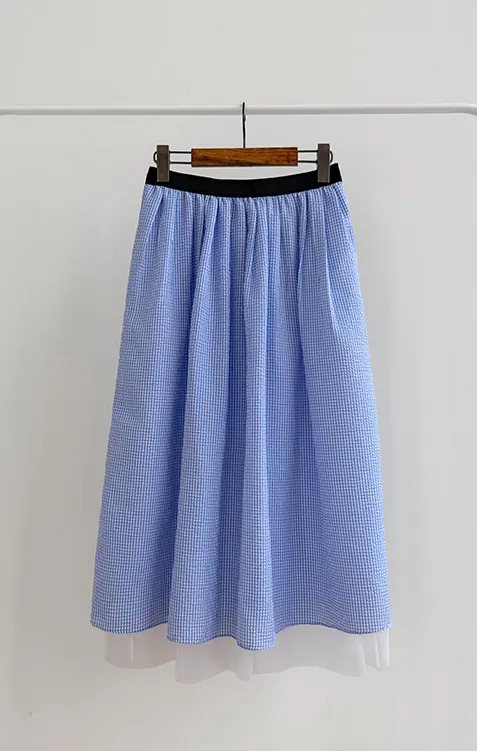 【雙面設計,兩面各具特色】【精緻格紋布料與輕款網紗布料巧妙融合】【長款網紗下擺,增添精緻感】【配色彈性腰帶,穿著舒適】