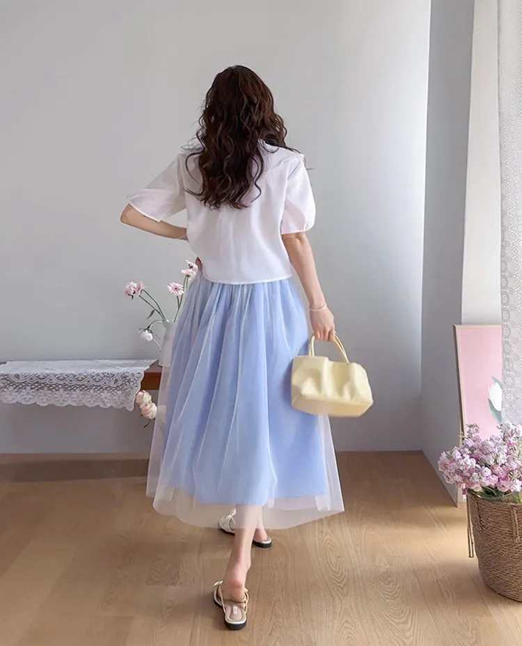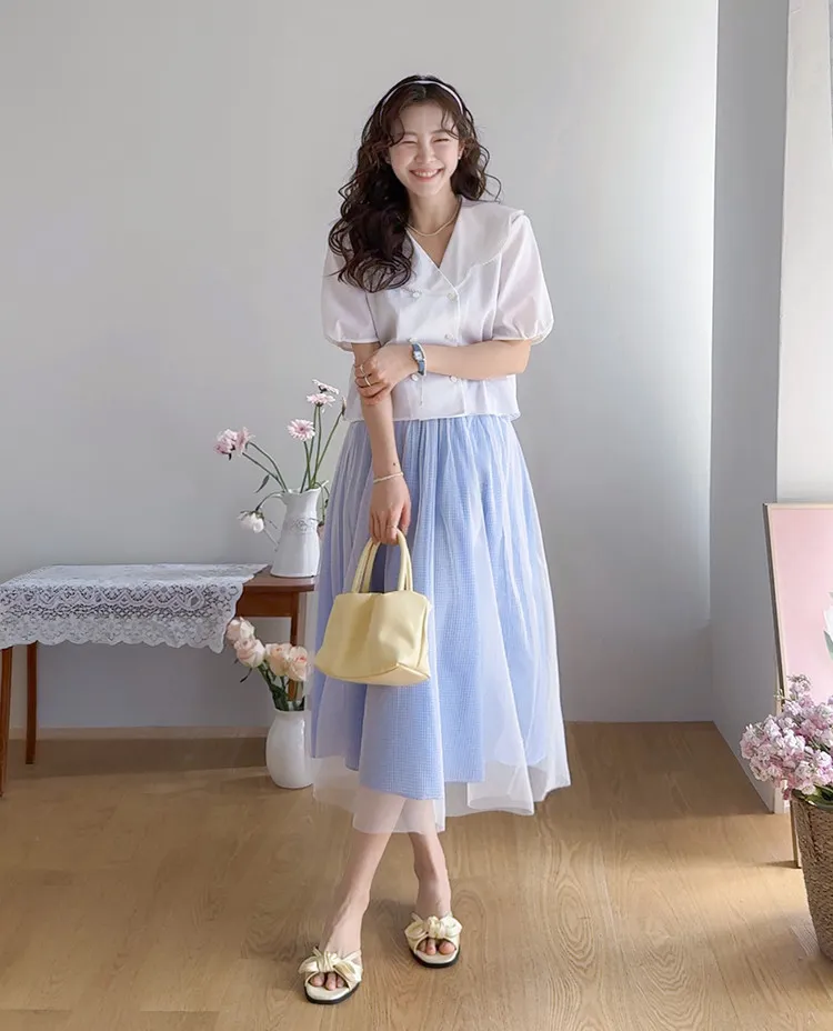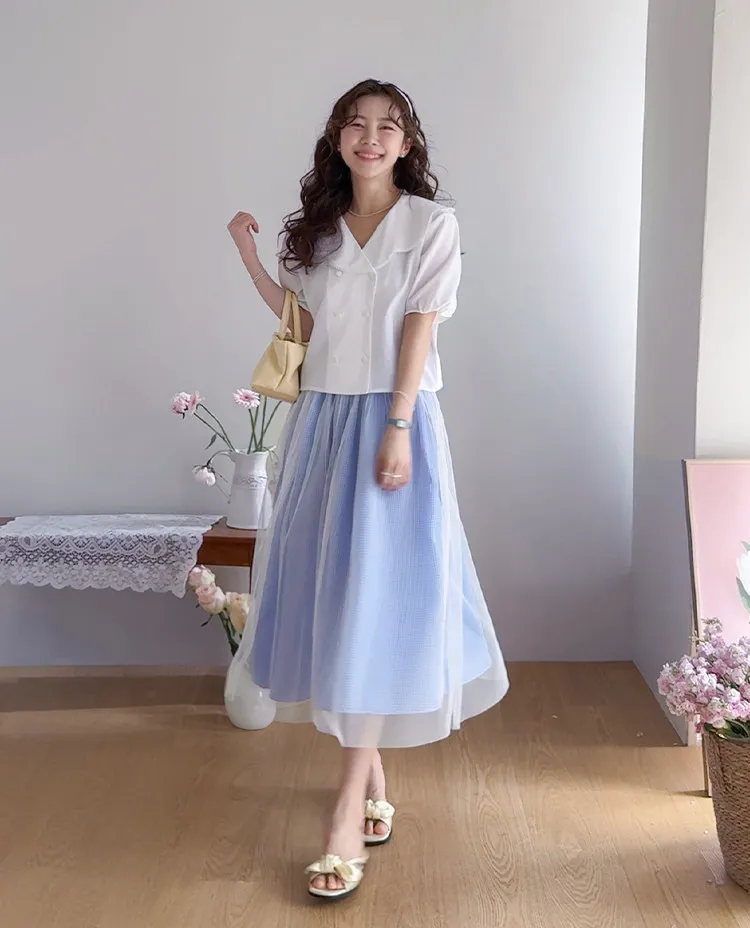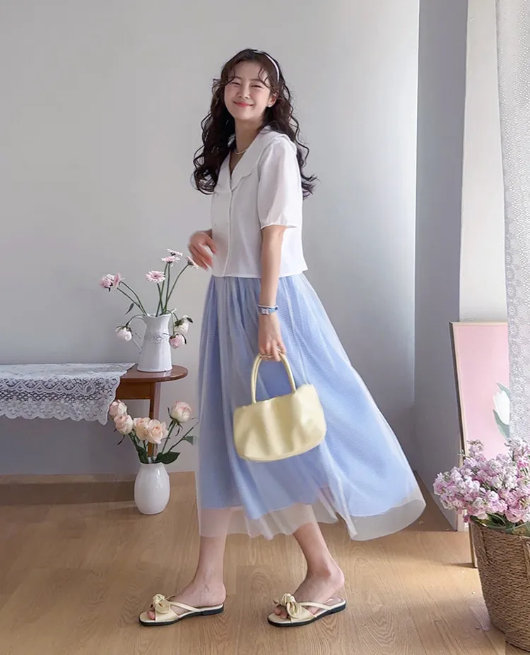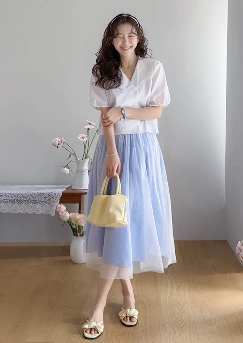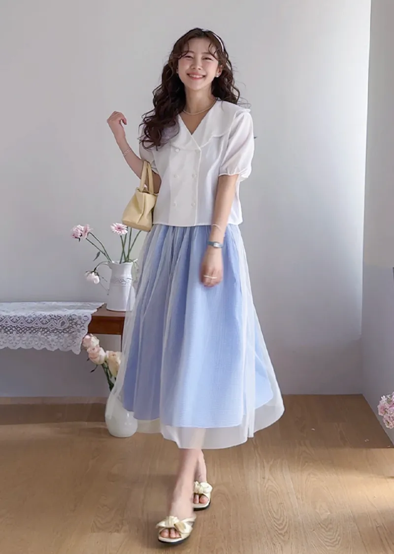 【雙面設計,兩面各具特色】【精緻格紋布料與輕款網紗布料巧妙融合】【長款網紗下擺,增添精緻感】【配色彈性腰帶,穿著舒適】