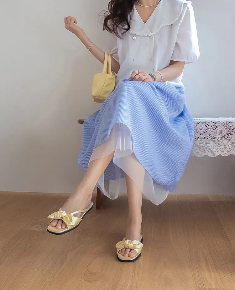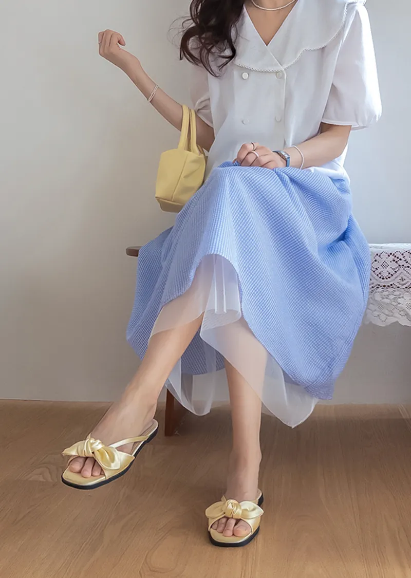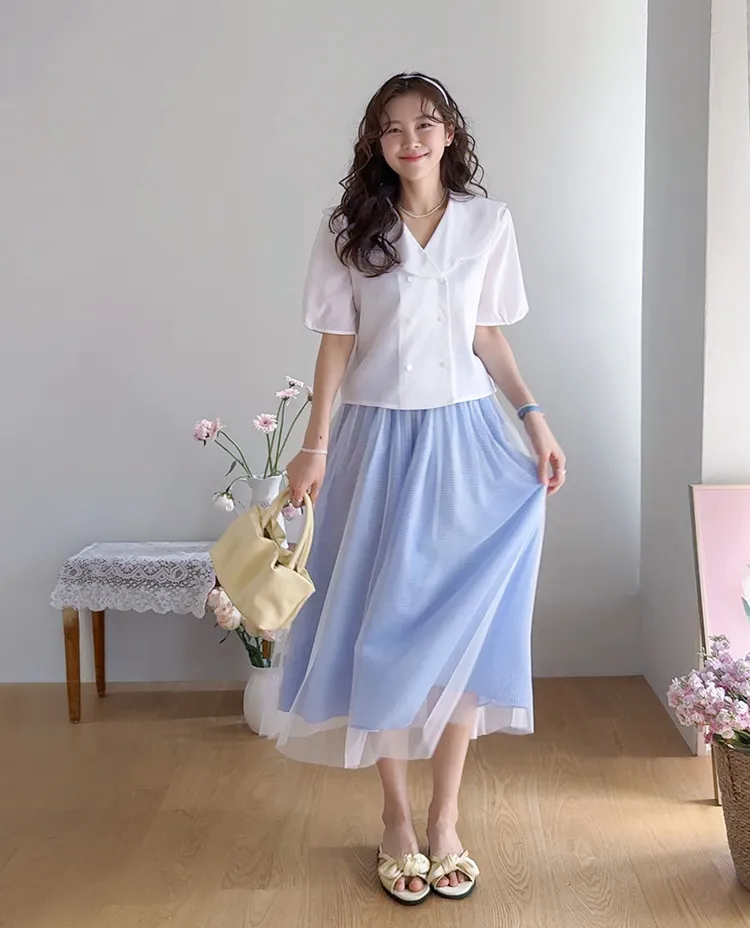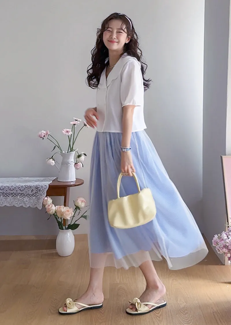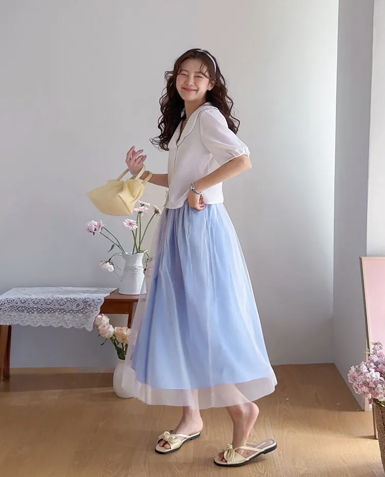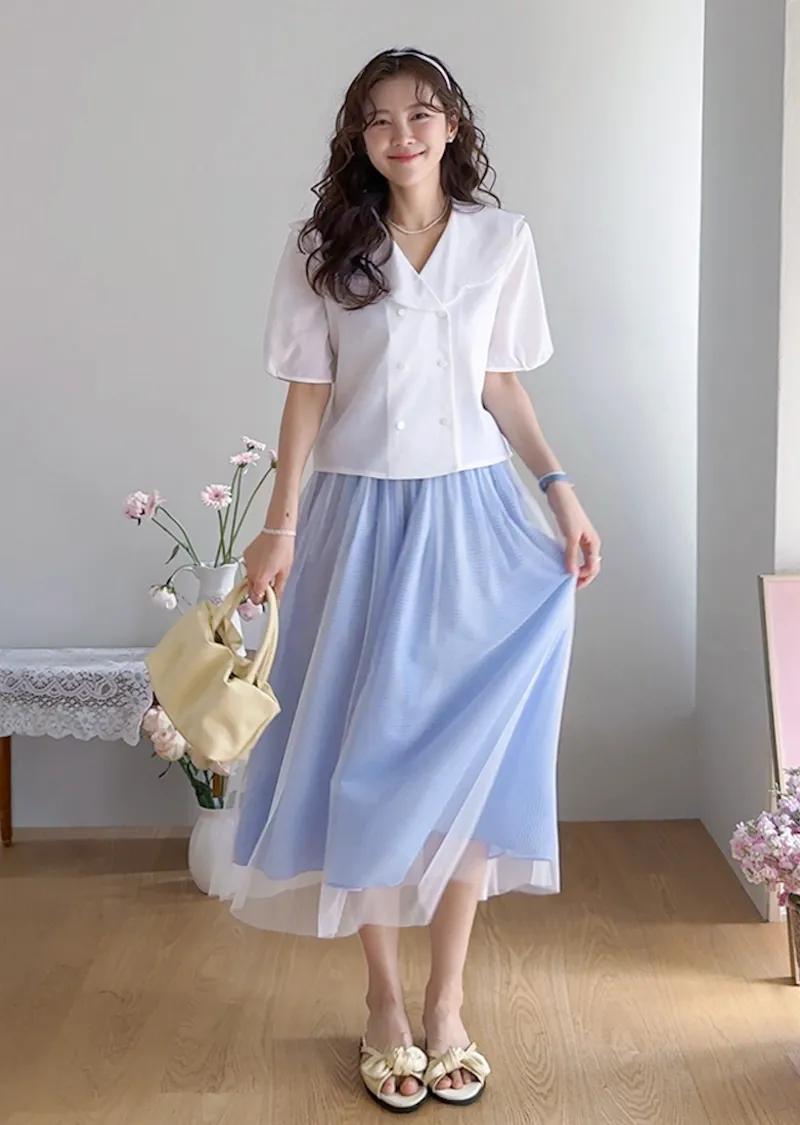 【雙面設計,兩面各具特色】【精緻格紋布料與輕款網紗布料巧妙融合】【長款網紗下擺,增添精緻感】【配色彈性腰帶,穿著舒適】