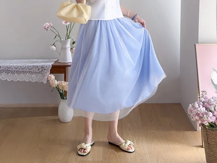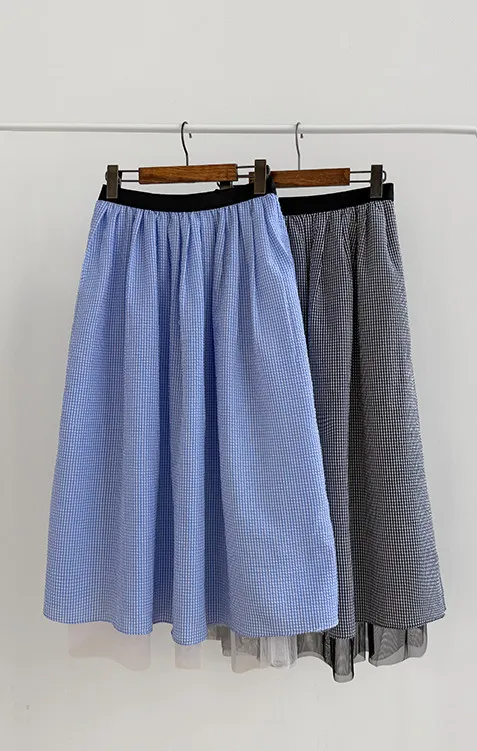 迷人氛圍兩穿精緻網紗格紋彈性中長裙