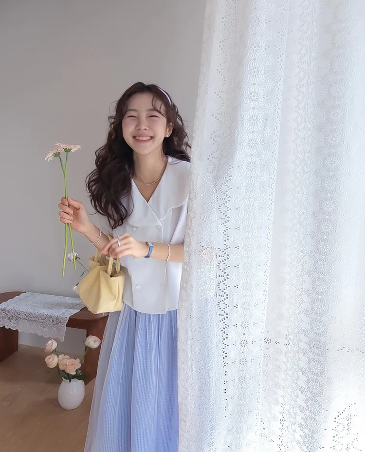 可愛迷你蕾絲飾邊波浪領雙排扣上衣