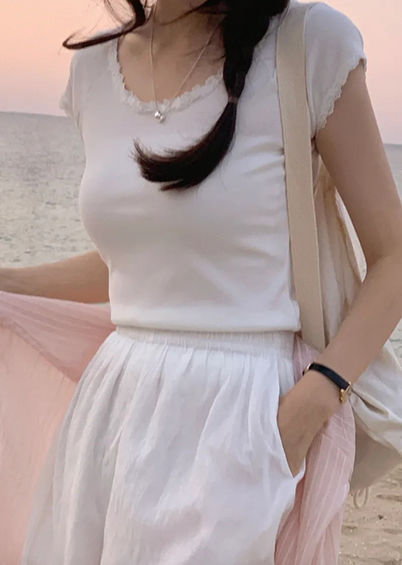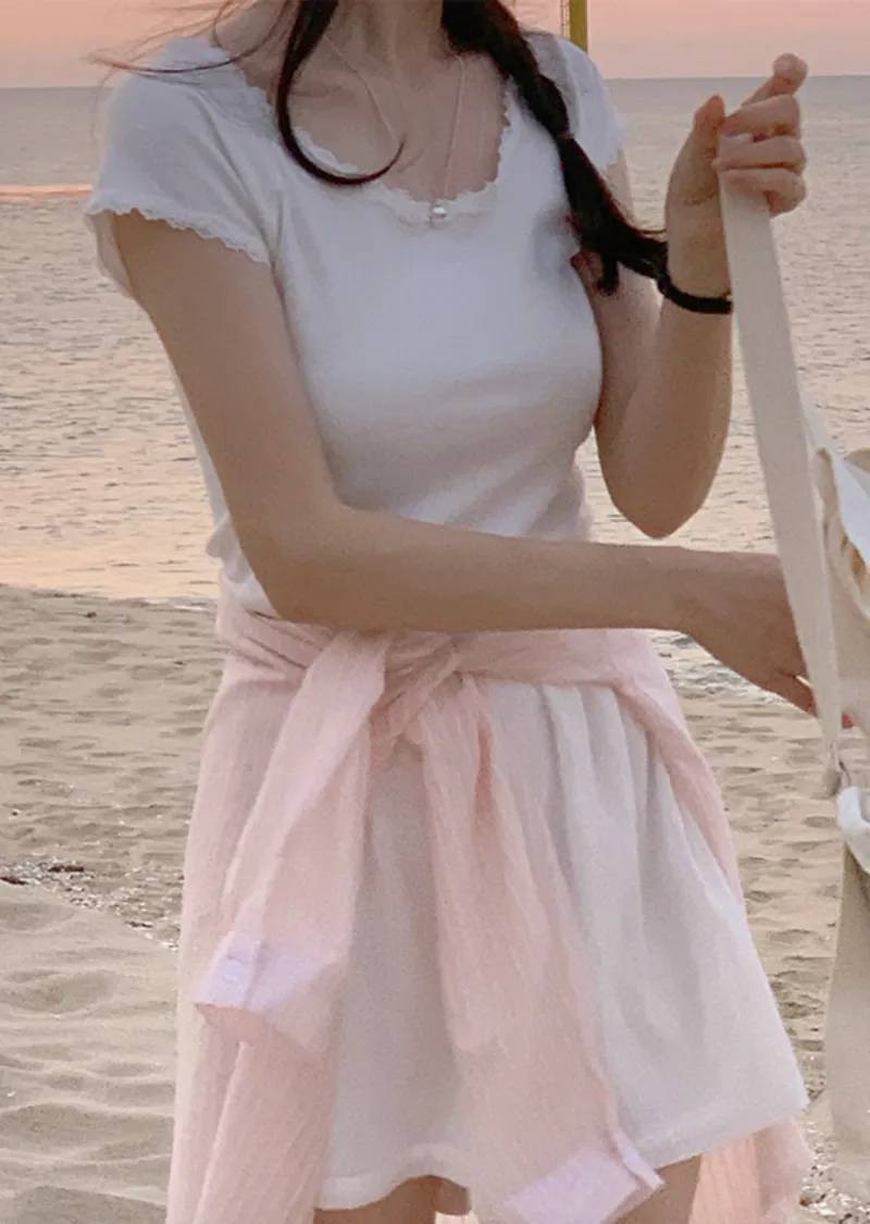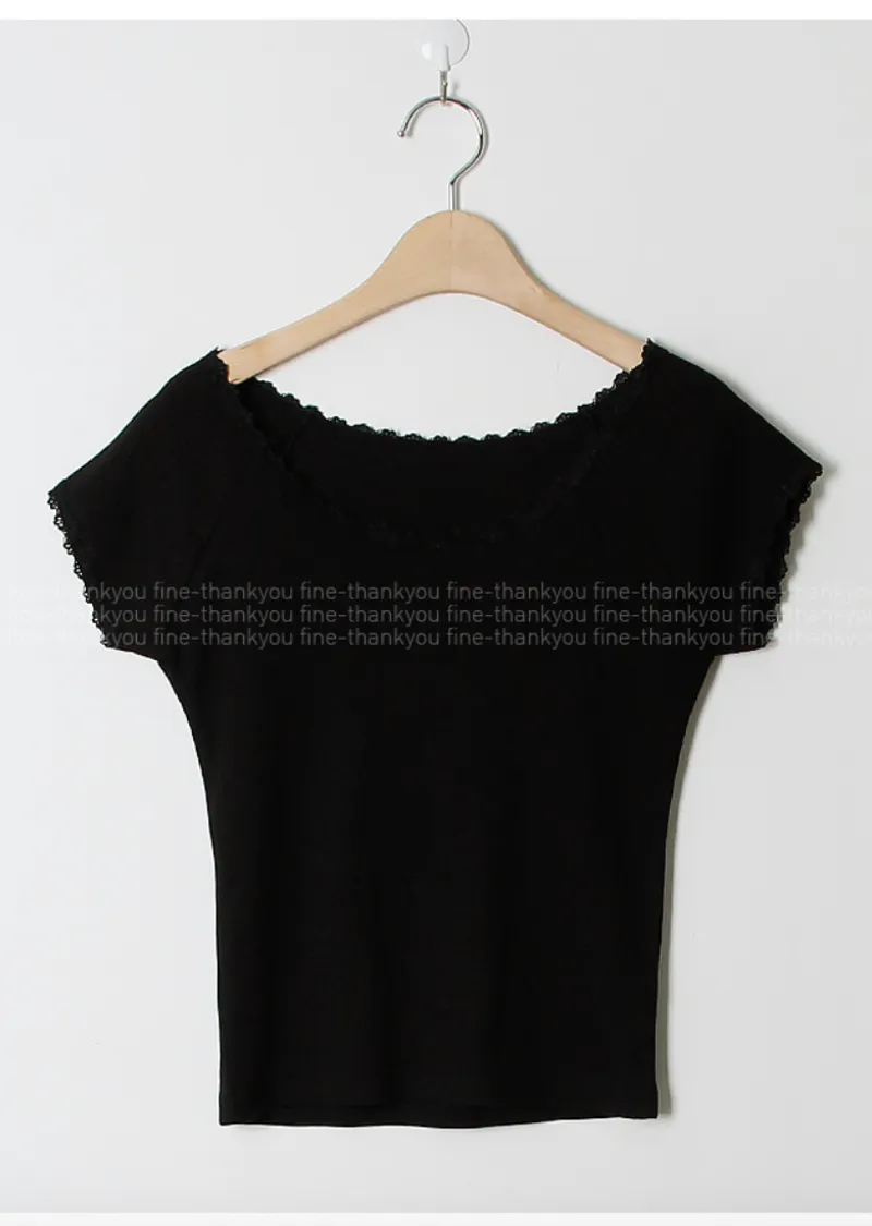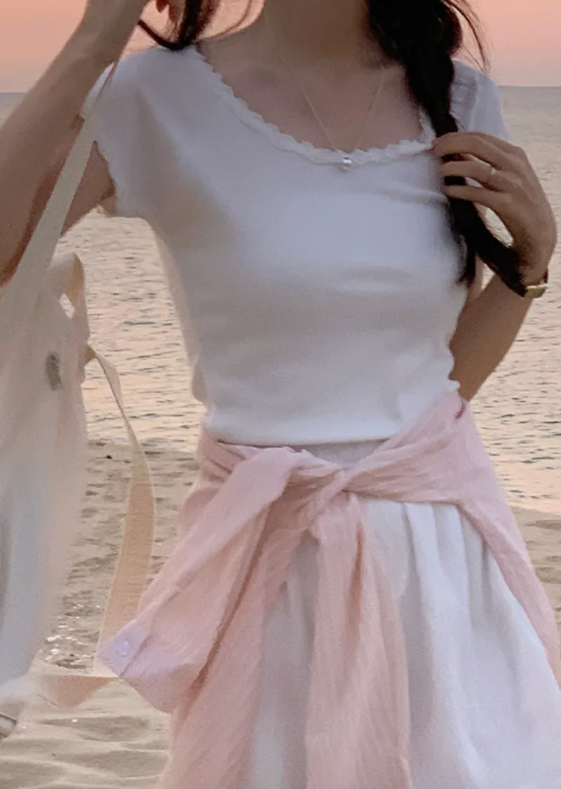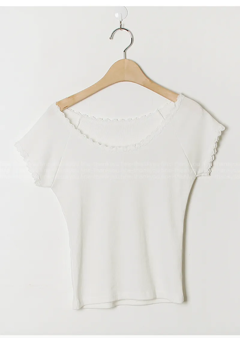 甜美領口袖末蕾絲襯邊修身短袖上衣