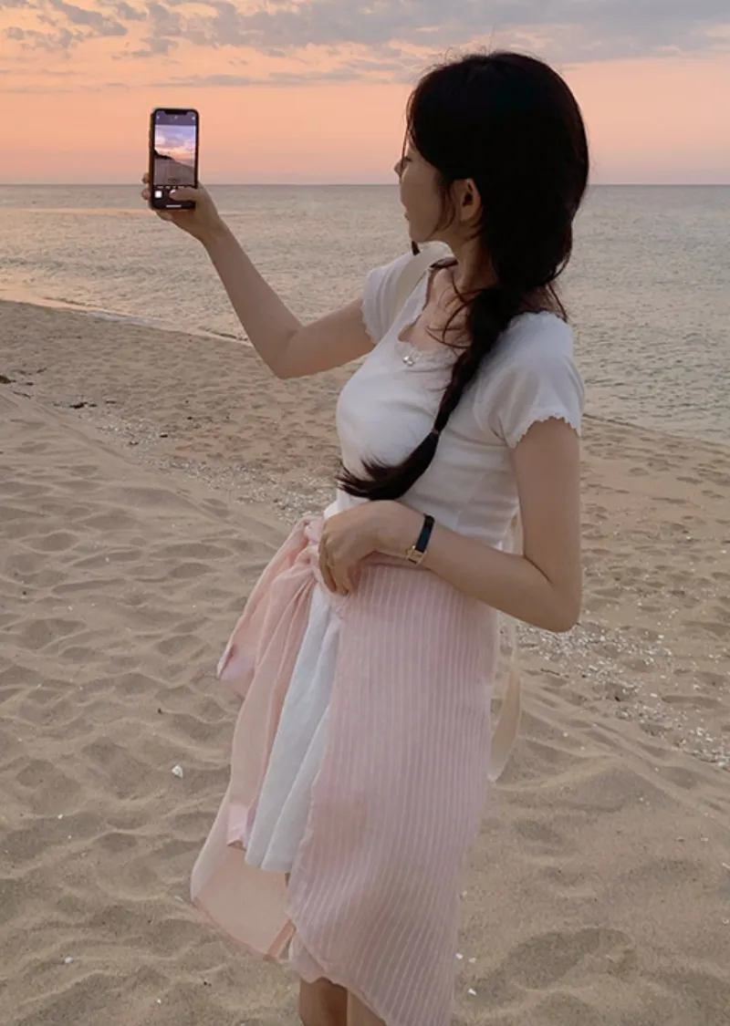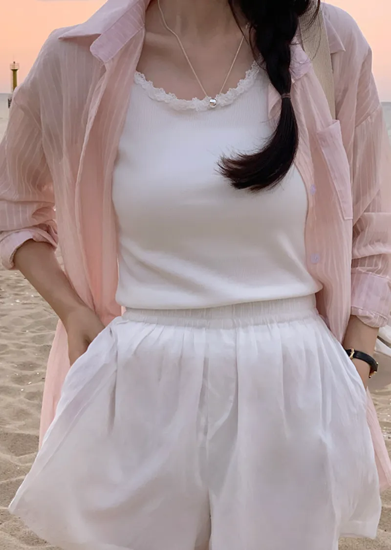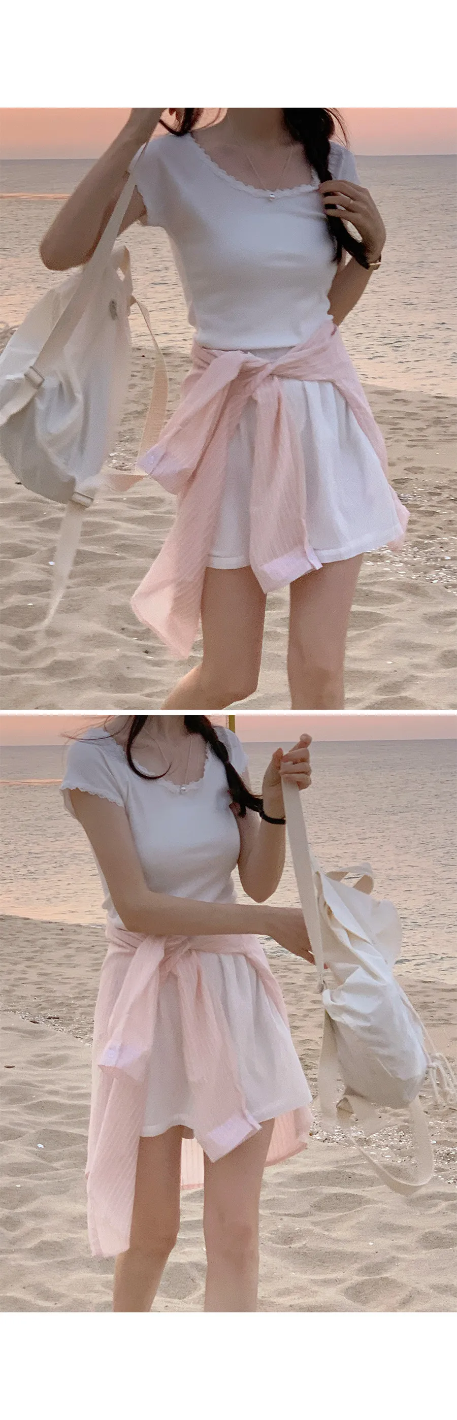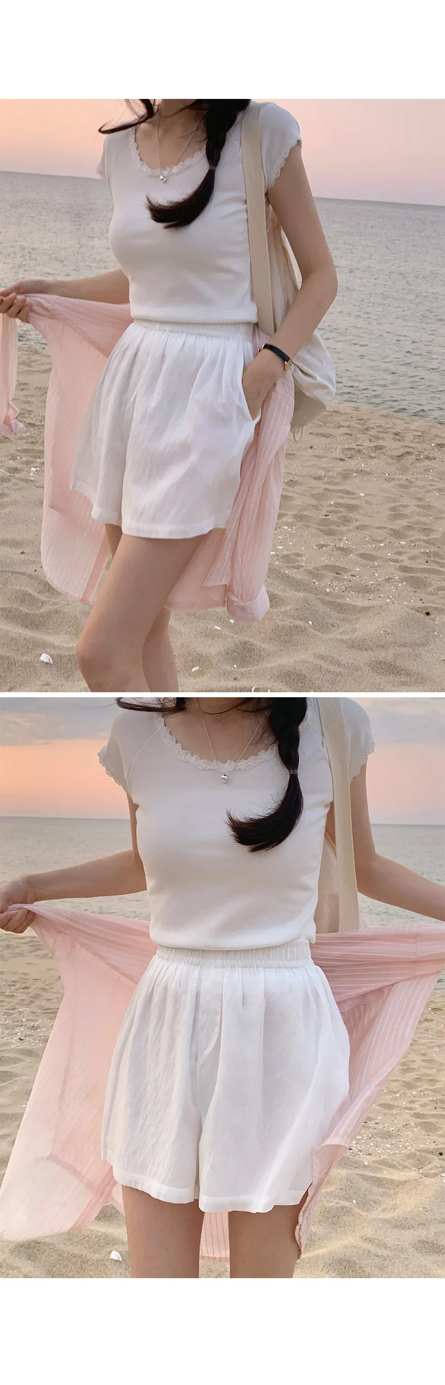甜美領口袖末蕾絲襯邊修身短袖上衣